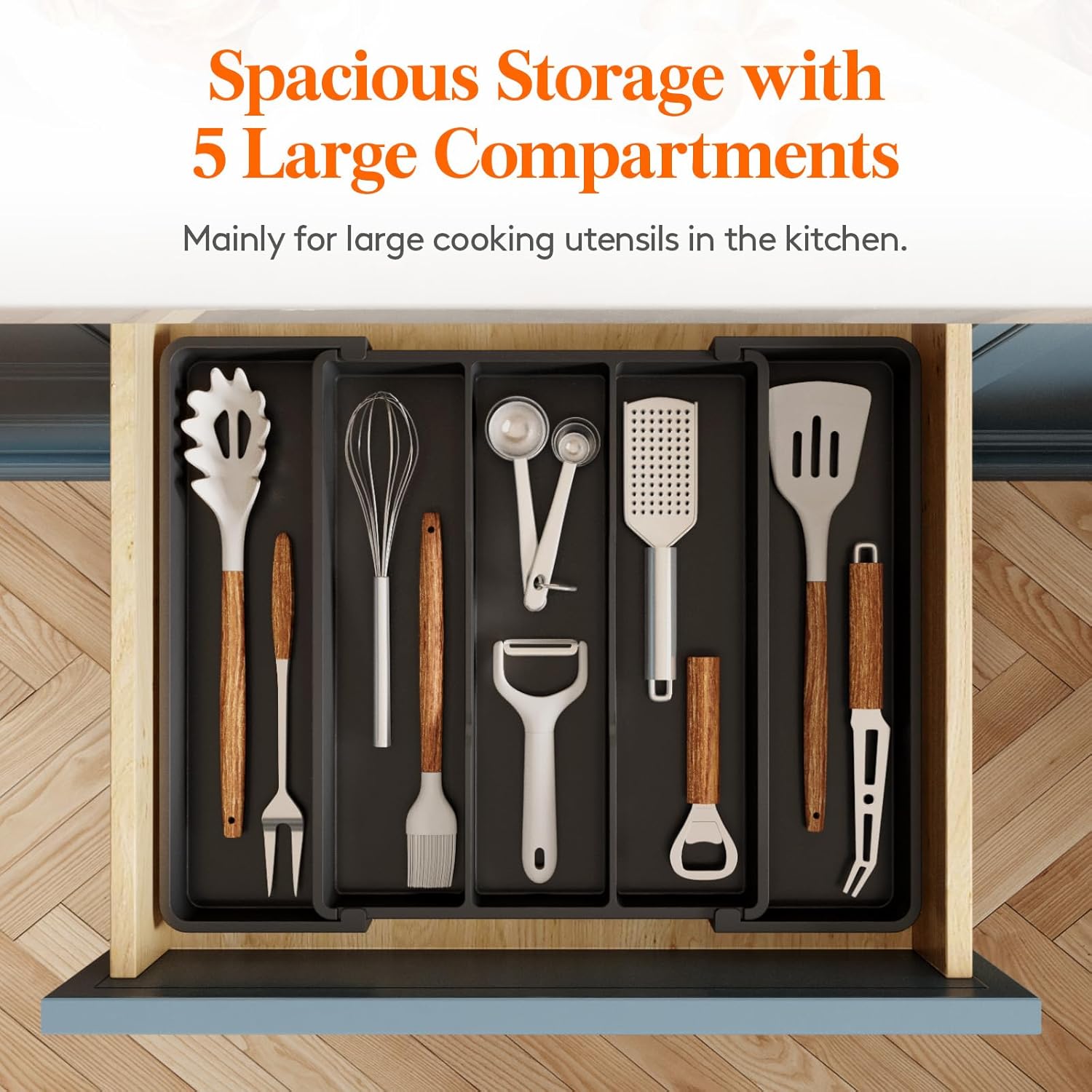 Lifewit Cooking Utensil Drawer Organizer, Expandable from 11 to 18 inches, Adjustable Cutlery Silverware Tray, Plastic Flatware Spatula Holder, Kitchen Tools Gadgets Storage Divider, Black