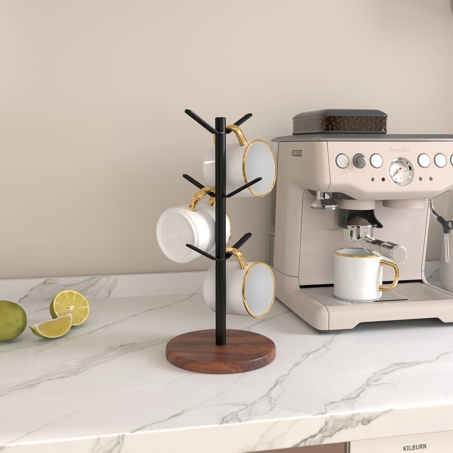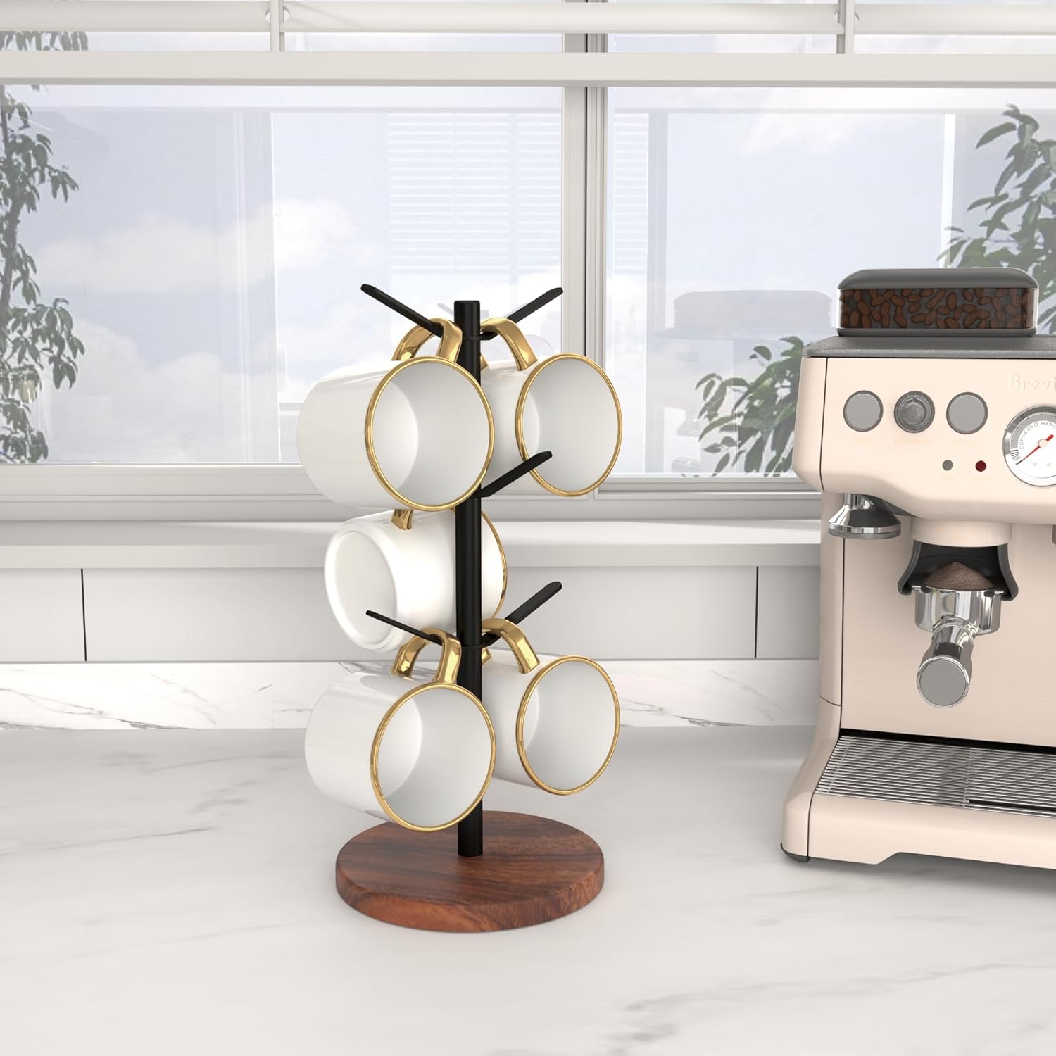 - 【Save Space & Stable】The mug stand takes up the space of one cup and can neatly store up to 6 cups. Its sturdy walnut base features 4 non-slip pads that prevent it from sliding on the tabletop, ensuring the coffee cup holder remains stable.