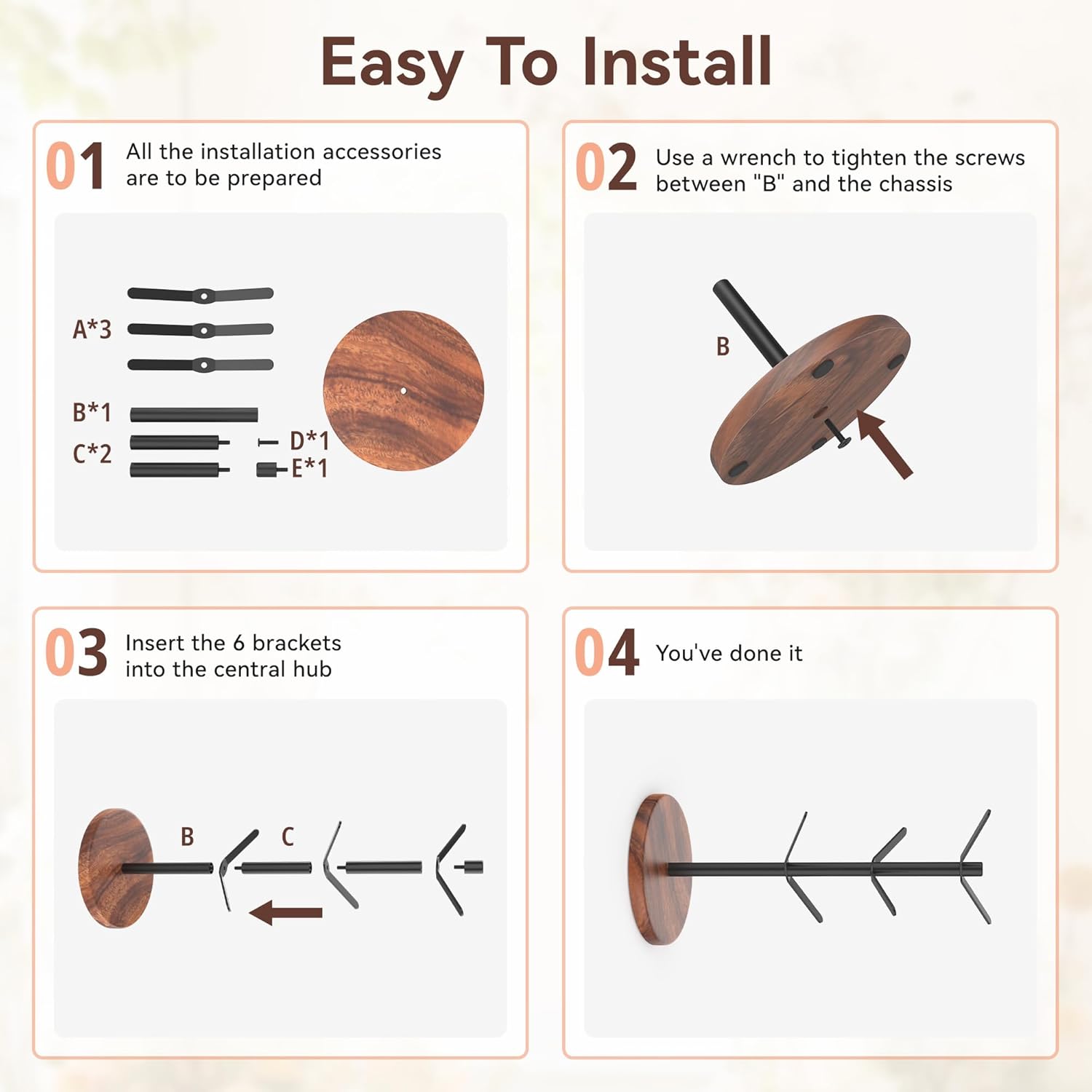 - 【Easy to Install】The package includes all the necessary installation accessories, tools and instructions, making assembly quick and easy. Simply fix the base with screws, then insert the branches into the slots in the main trunk. The process is stress-free.