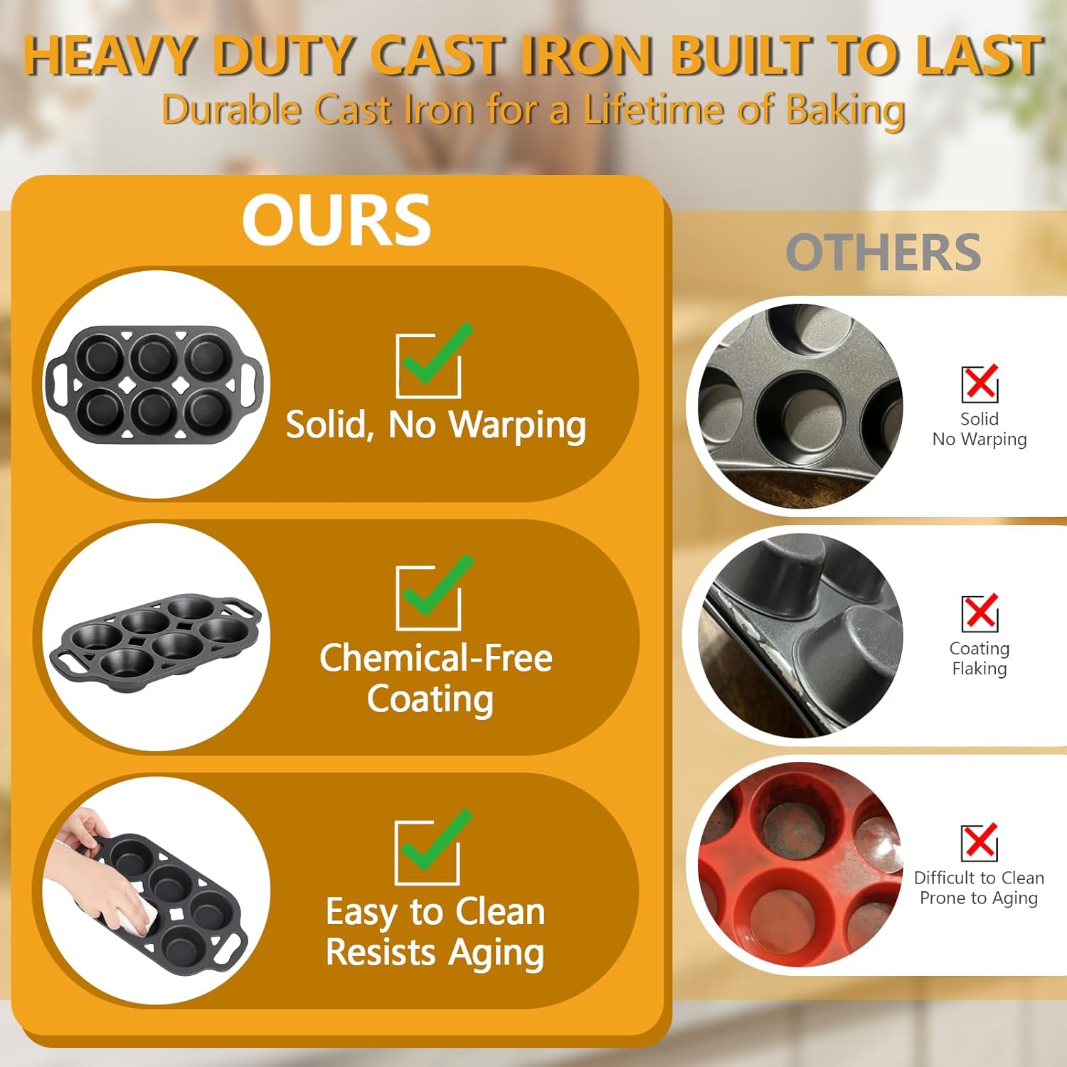 - EASY RELEASE & HEALTHY BAKING: The cast iron cupcake pan is pre-seasoned with vegetable oil to create a naturally non-stick surface. Free from PFOA and PTFE, it ensures easy release and safe, worry-free baking