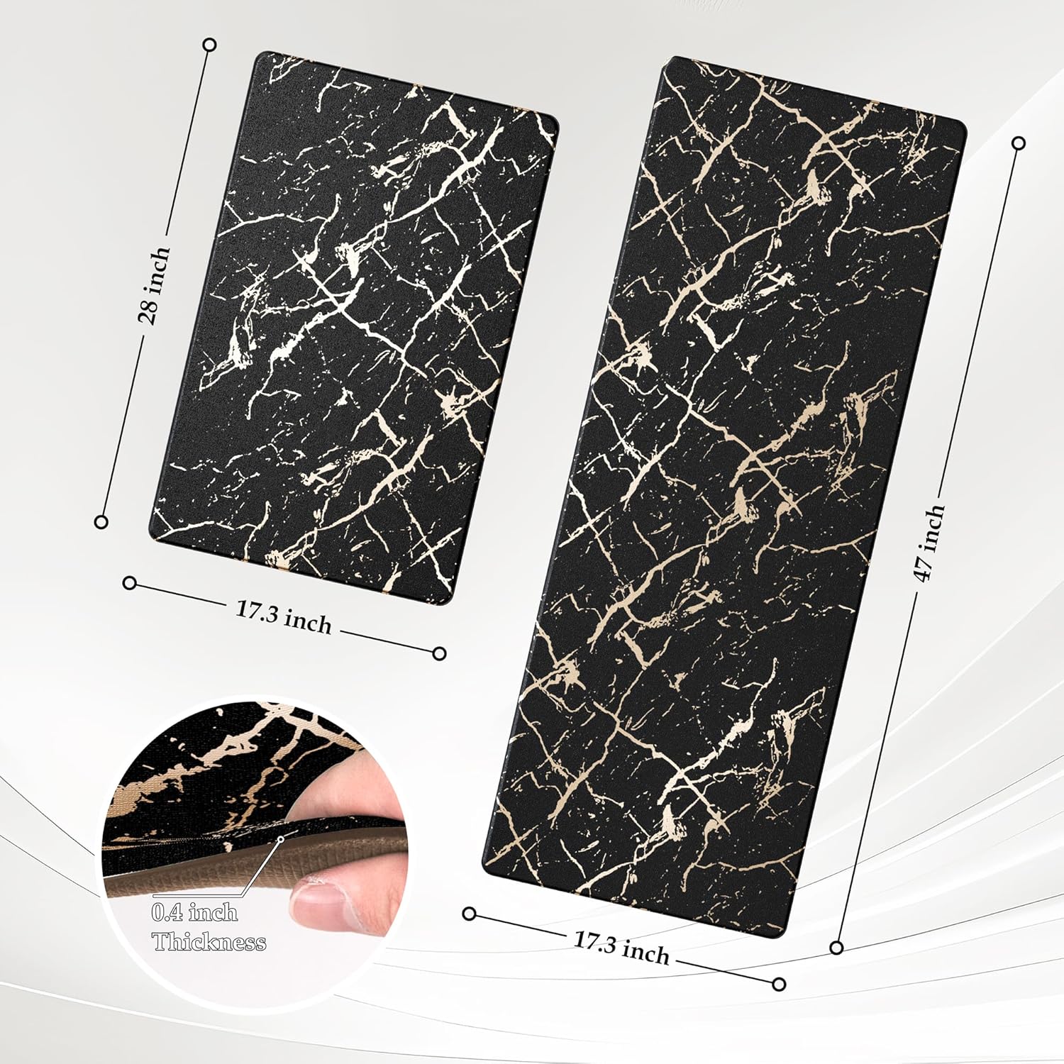 Gold Foil Stamped Marble Kitchen Mats for Floor 2PCS Cushioned Anti Fatigue Non Slip Waterproof Comfort Leather Kitchen Rugs 2/5 Inch PVC Kitchen Mats for Sink, Laundry, 17.3"x28"+17.3"x47", Black