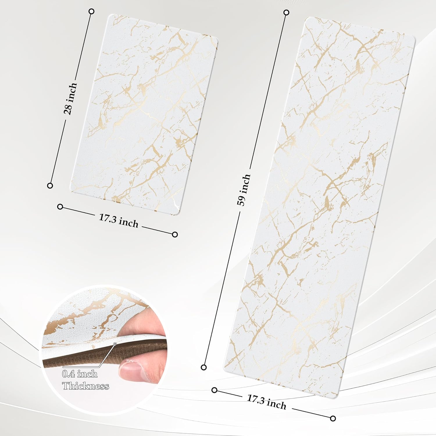 Gold Foil Stamped Marble Kitchen Mats for Floor 2PCS Cushioned Anti Fatigue Non Slip Waterproof Comfort Leather Kitchen Rugs 2/5 Inch PVC Kitchen Mats for Sink, Laundry, 17.3"x28"+17.3"x59",White