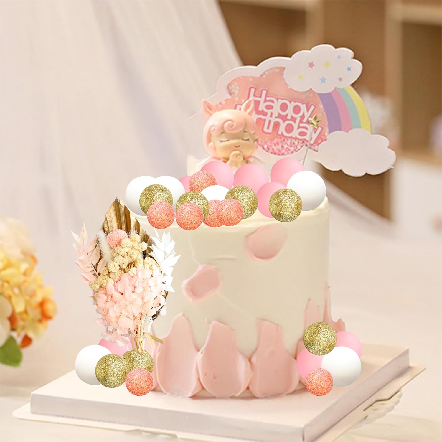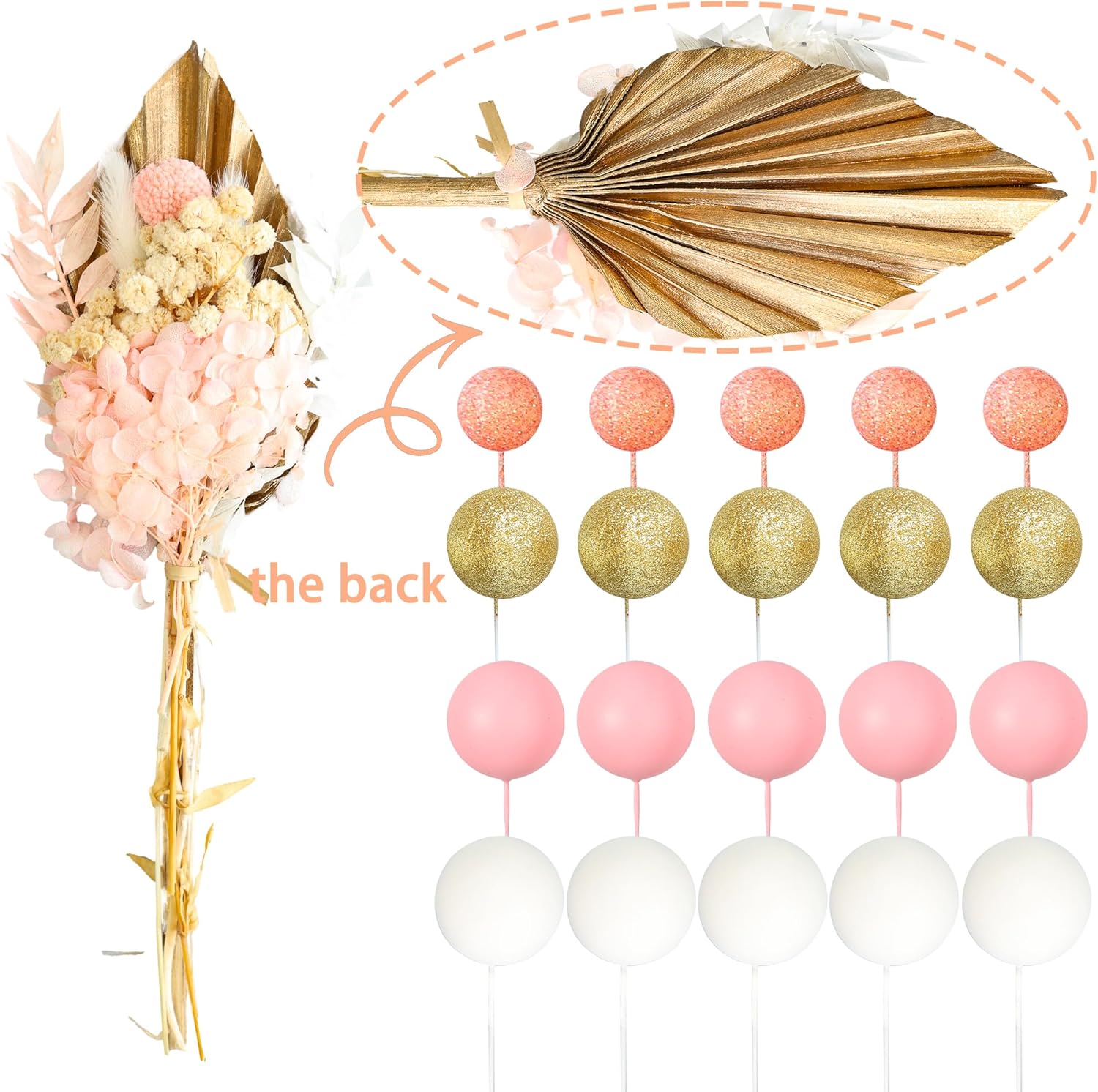 Gyufise 21 Pack Flower Boho Cake Topper Ball Cake Decorations Palm Leaves Plants Cake Decor for Girl Bohemian Princess Theme Wedding Baby Shower Birthday Party Supplies Gold Pink