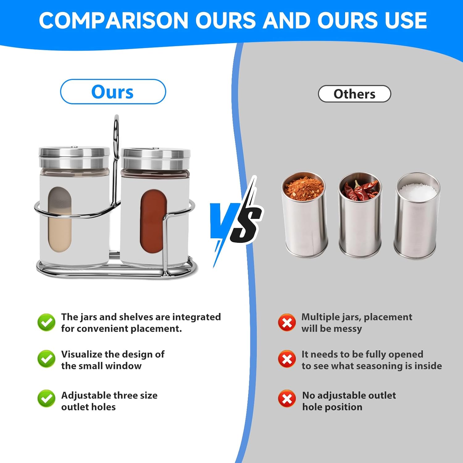 - Salt and pepper seasoning set with two seasoning jars, a seasoning jar rack, you can store a variety of seasonings, three sizes of connecting holes
