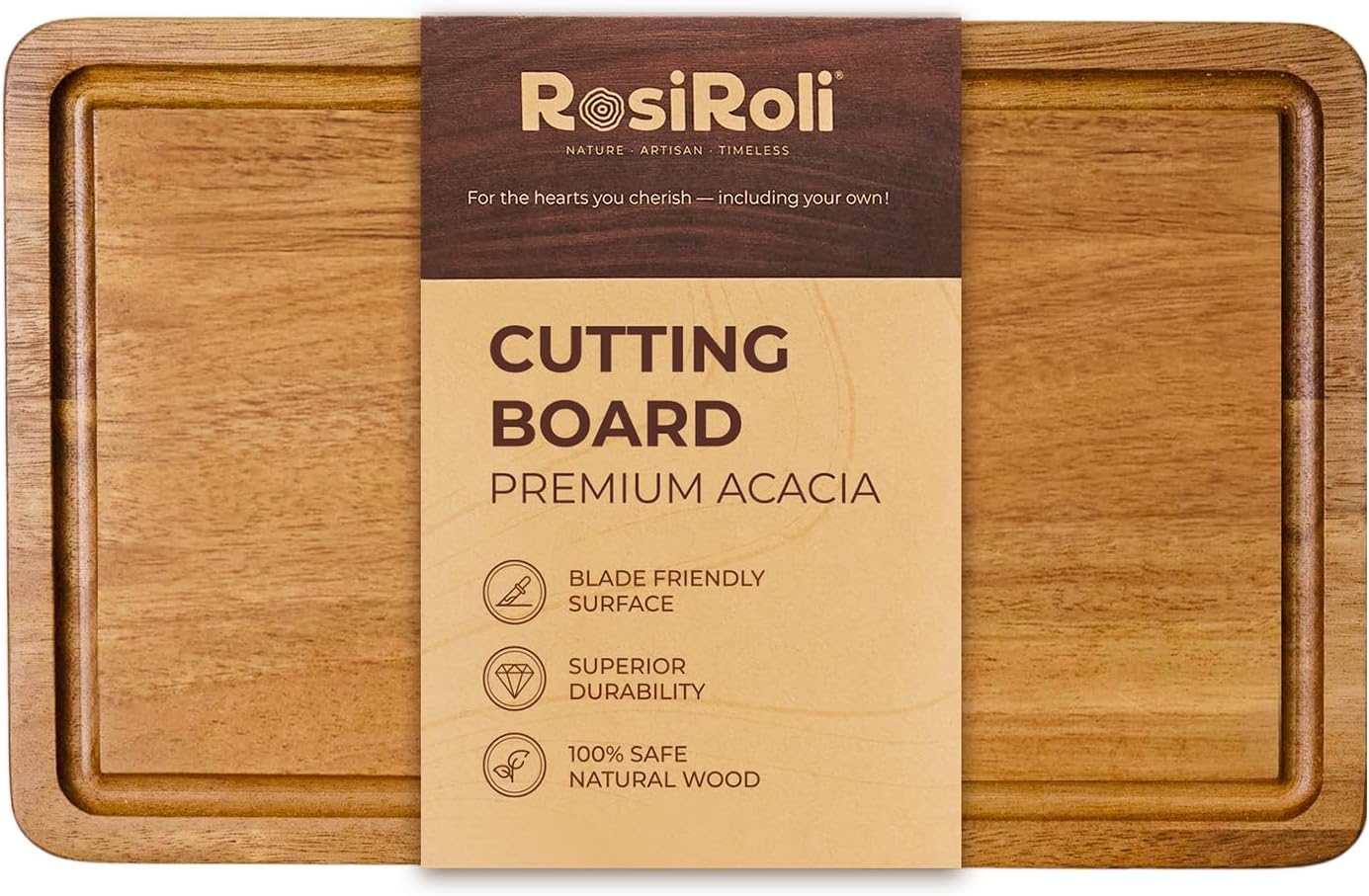 - Selected Wood & Knife Friendly - Crafted of solid natural acacia wood. Designed to protect the sharpest blades, our wood boards also provide stability during use and look handsome enough to keep out on the counter.