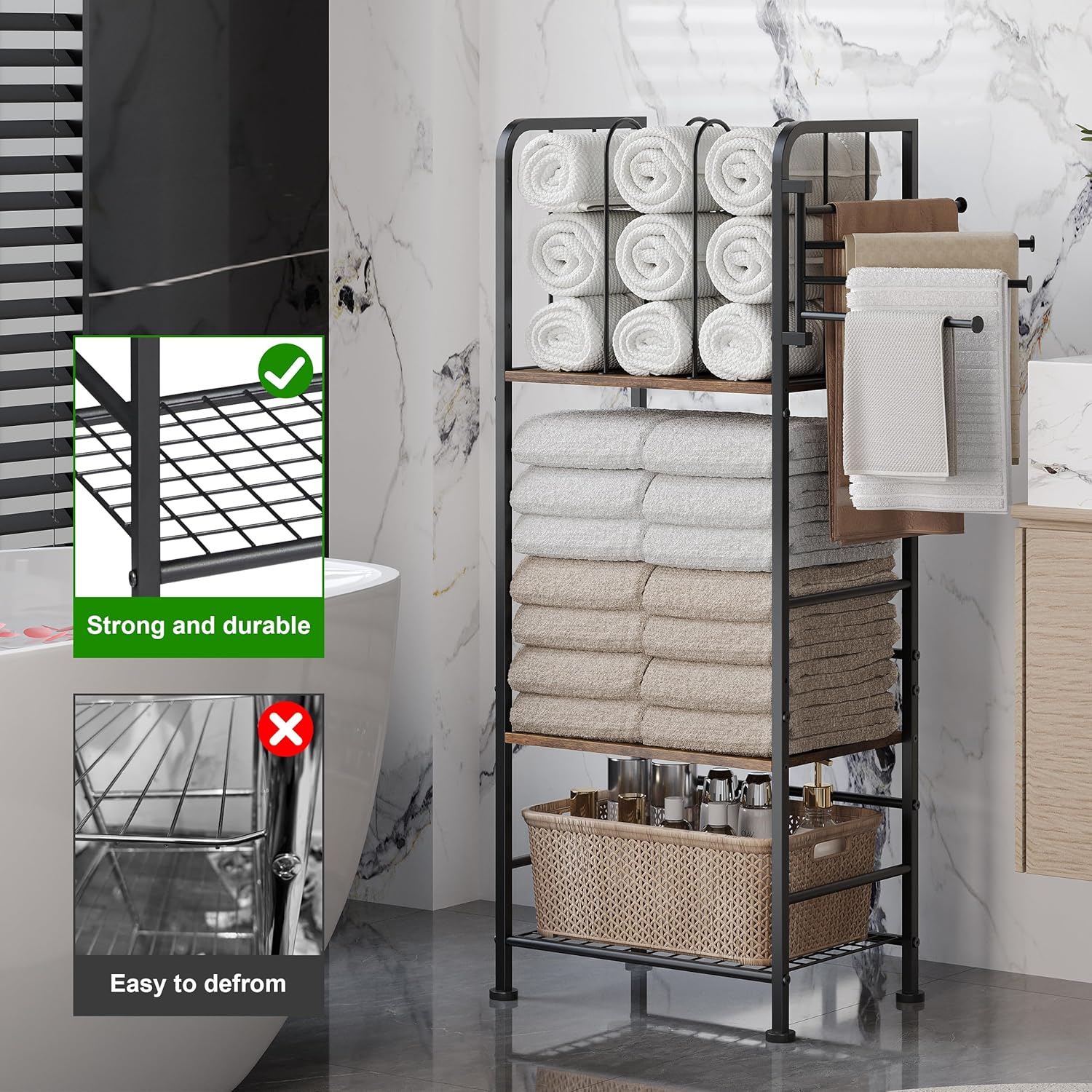 - ăSpacious 3-Tier ShelvingăWith three spacious shelves, this towel shelf offers plenty of room for all your bathroom essentials. The top two levels are perfect for storing towels, while the bottom shelf can hold various toiletries and skincare products. The towel racks for bathroom storage allow you to keep everything organized, making your bathroom orderly and easy to maintain.