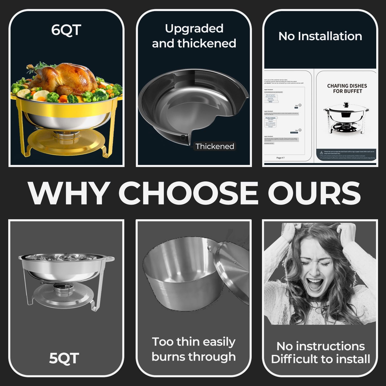 - Sophisticated Presentation for Special Events Ideal for weddings and formal receptions, these 6-quart stainless steel chafing dishes add a refined touch to any elegant setting. Offered in both gold and silver tones, the graceful appearance complements upscale décor while keeping food warm and delicious. Each set includes four gold serving tongs, elevating your catering service and impressing every guest.