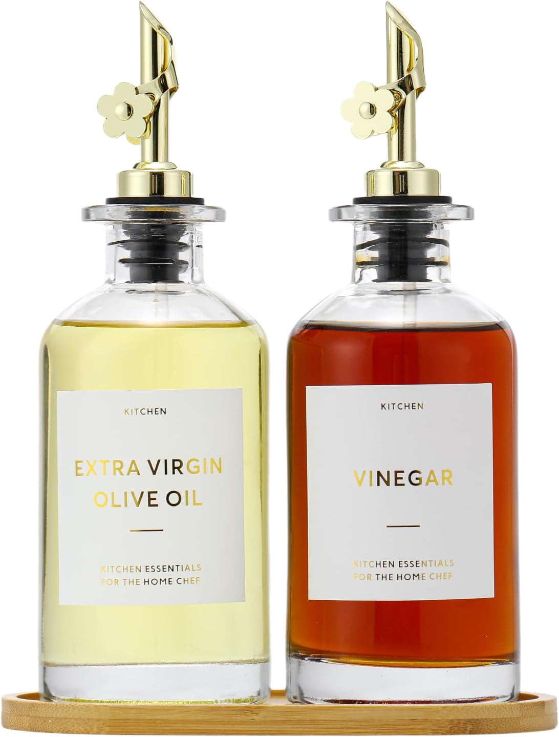 - IDEAL GIFT - Whether you are looking for oil dispenser bottle or kitchen accessories, this olive oil and vinegar dispenser bottle set is your best choice. It's also a perfect gift for your mother, family and friends, housewarming gift and Christmas gifts.