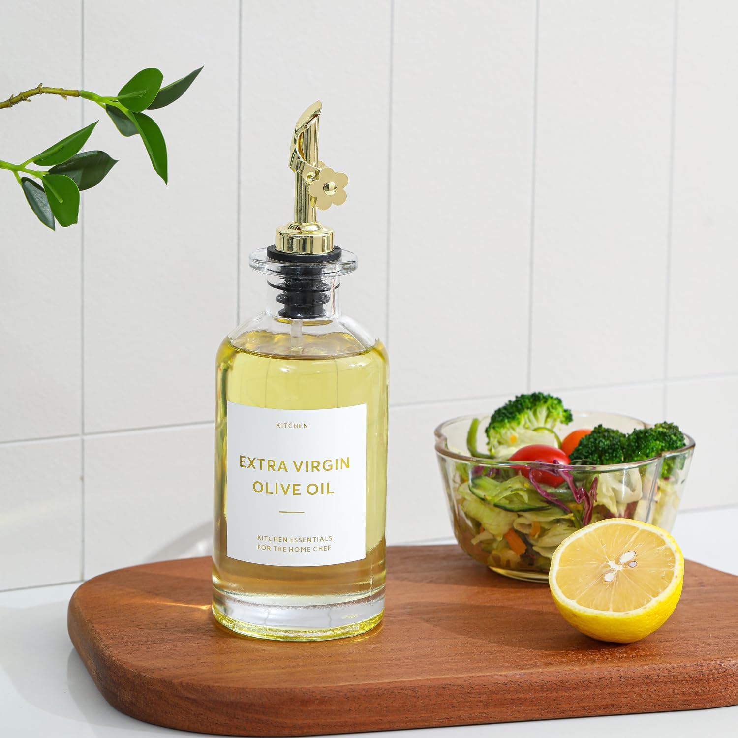 - KITCHEN OLIVE OIL BOTTLES – The oil and vinegar dispenser set contains 2 transparent 11.8oz (350ML) glass bottles, 2 gold stainless steel oil spouts, 17 gold waterproof labels(kinds of oil and vinegar) and a bamboo tray, Ideal for safely store and dispense your olive oil and vinegar.