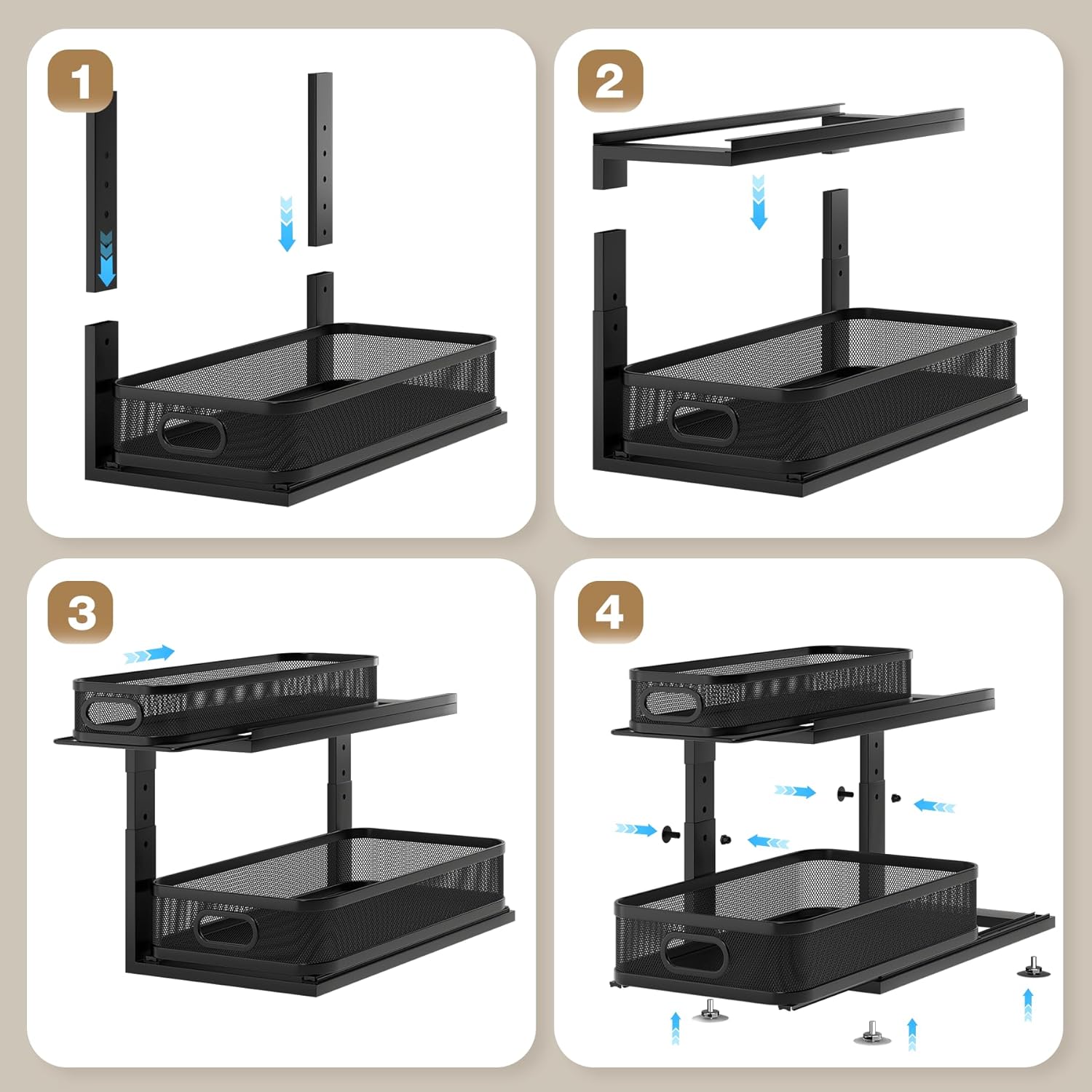 - 【Chic & Precision Mesh Fits Small Items】Under cabinet organizer features a sleek, modern mesh design that stores large bottles while neatly holding smaller items, preventing them from slipping through gaps. Style and practicality blend seamlessly into your space.