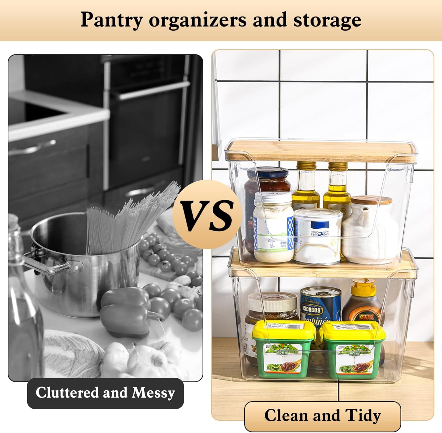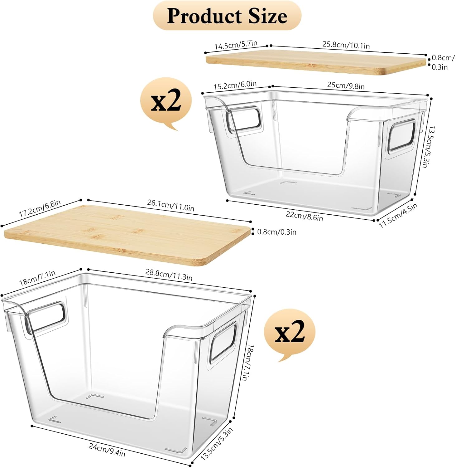 - Product Size and Composition: The size of the kitchen storage organization is 29cm*18cm*18cm (11.3in*7.1in*7.1in) for the large size and 26cm*15cm*13.5cm (9.8in*6in*5.3in) for the small size. You will receive the package inside containing 2 large and 2 small storage organizers, a total of 4 pantry storage boxes to help you organize and store your items quickly and easily.