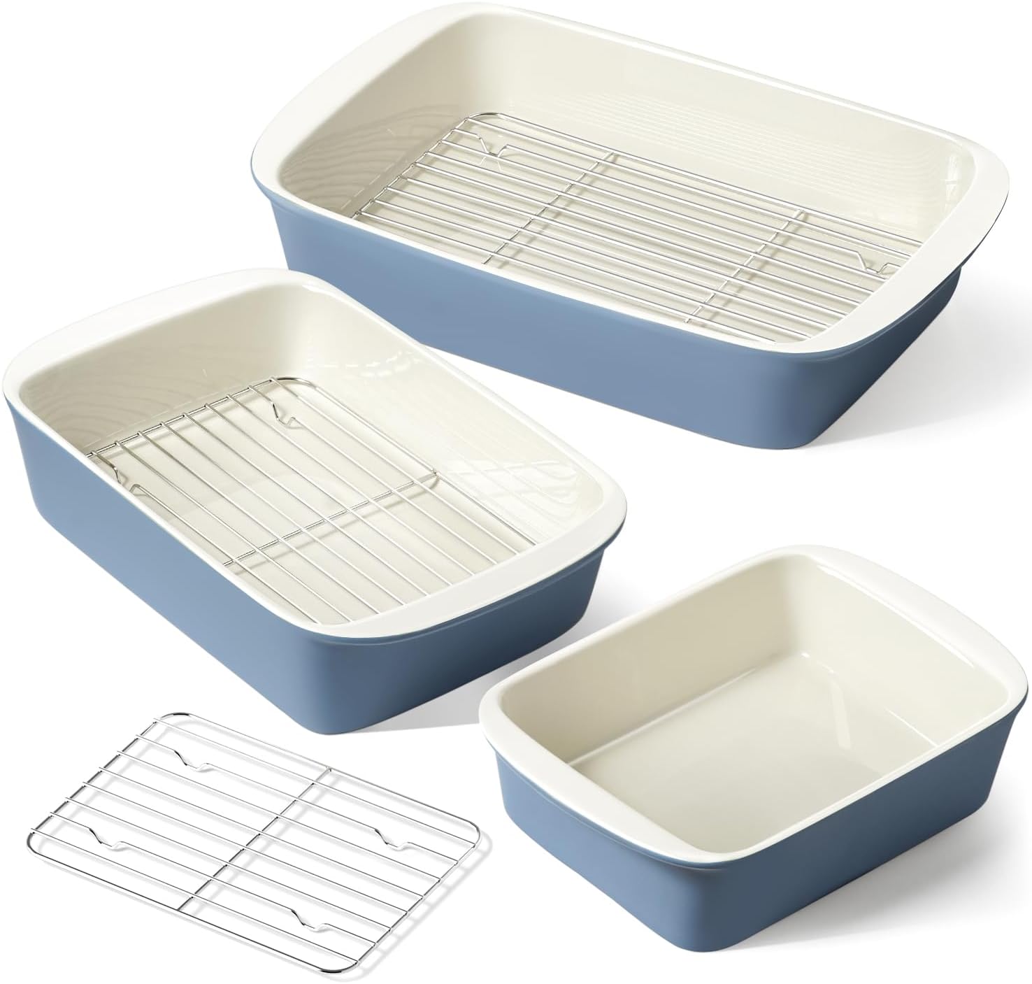 LE TAUCI Deep Casserole Dishes for Oven, 13.7”x9.6” Ceramic Baking Dish Set with Roasting Racks, Large Lasagna Pans with Handles, Rectangular Bakeware as Gift for Mom, Dusty Blue (4.6QT/3.0QT/1.6QT), Set of 3