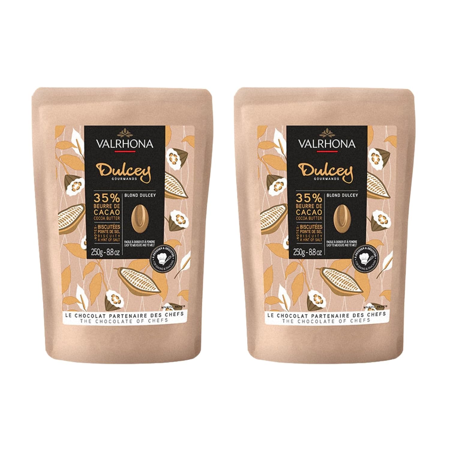 Valrhona Premium French Baking Blonde Chocolate Discs (Feves). DULCEY 35% Cacao. Creamy, Caramel Cookie Flavor Notes. Easy Melt & Tempering. Creamy, Balanced, For Luscious Frostings. 250g (Pack of 2)