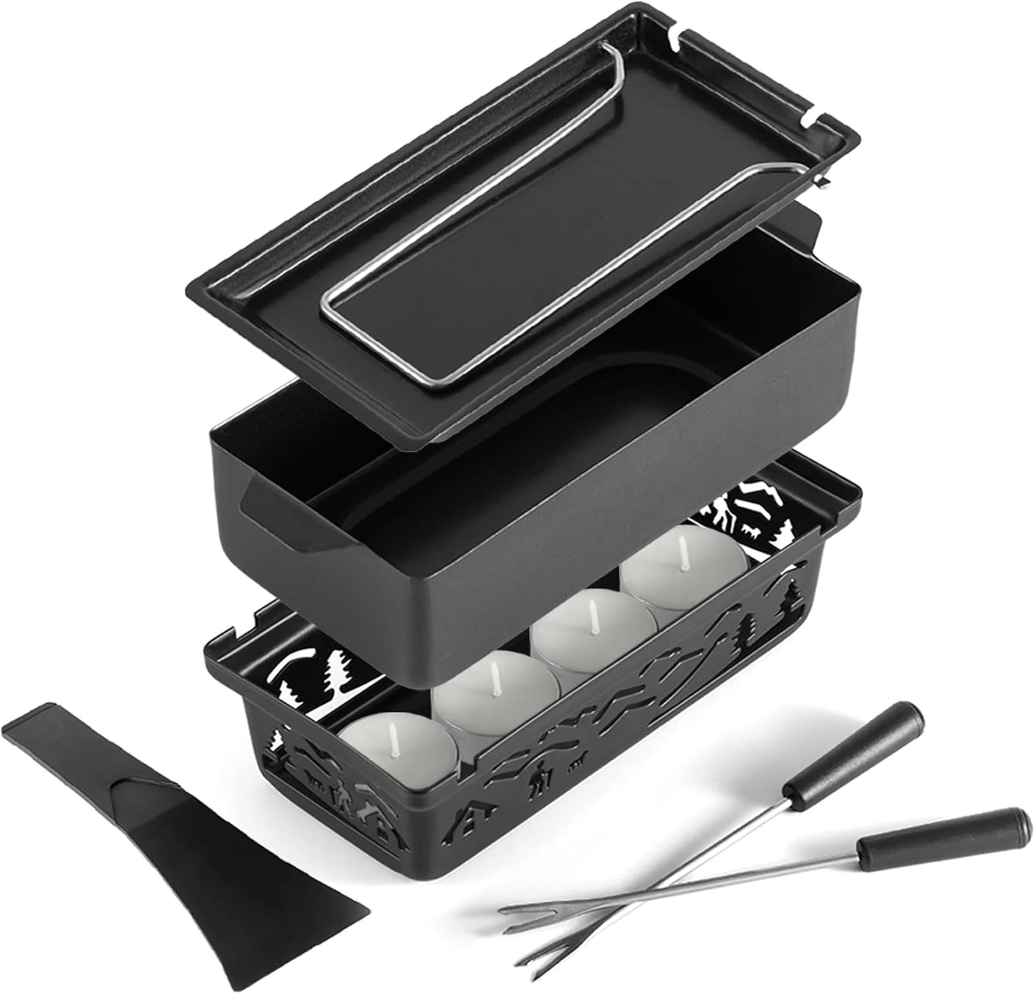 - Complete Serving Kit Included β Comes with everything you need: base stand, fondue pot, raclette dish, raclette spatula, 2 fondue forks, and 4 tealight candles.