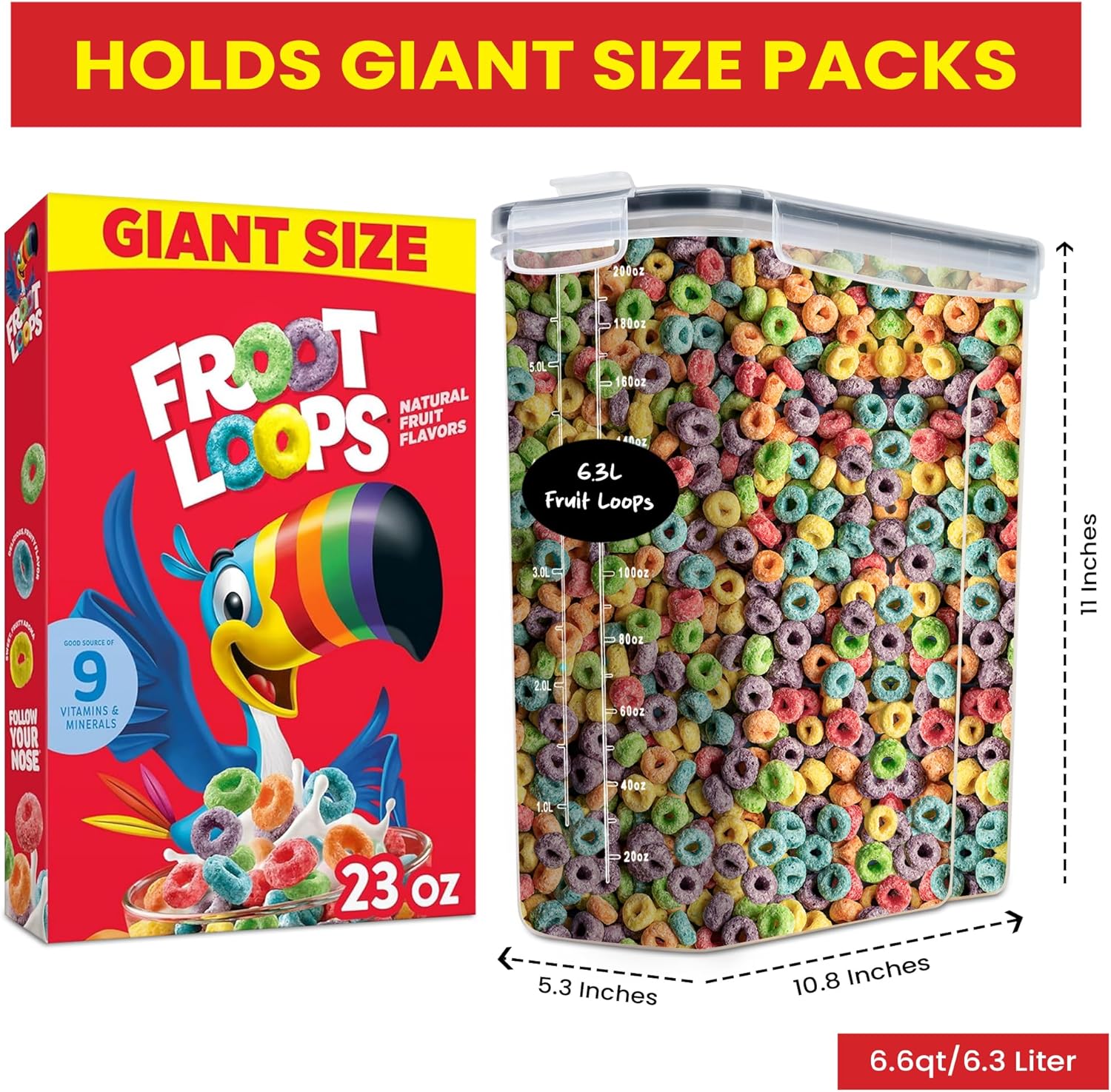 - Bulk Storage: These large food storage containers with lids are designed to hold mega-size cereal boxes and more each cereal container holds 6.6 qt/6.3 liter.