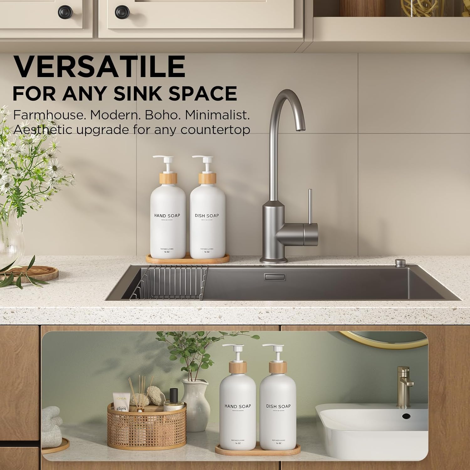 - 【FITS ANY DECOR】 – From luxury and farmhouse to modern minimalist, this elegant hand soap dispenser set blends effortlessly with your kitchen or bathroom style.