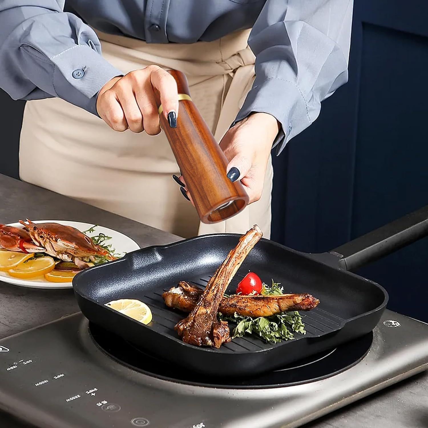 - Chic Design For Kitchen: This modern salt grinder Refillable ergonomics streamlined wood pepper mill body looks elegant and smart On your Table at all times and charm your family and guests. Fill it with the spice of your choice