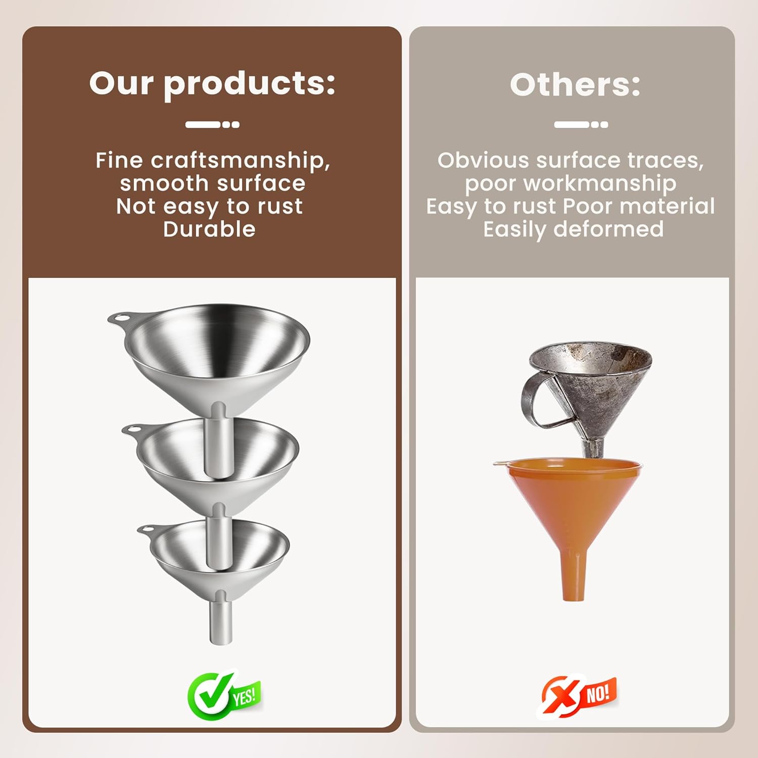 - [Durable Stainless Steel Funnel] Made from high-quality stainless steel, this funnel is strong and long-lasting. It resists cracking, bending, scratching, rust, and deformation, outperforming plastic funnels for extended use.