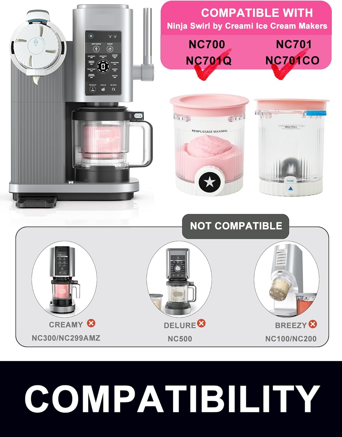 - Seamless Fit for Ninja Creami Swirl: Precisely designed for Ninja Swirl by CREAMi NC700/NC701 Series Ice Cream & Soft Serve Makers. NOT compatible with NC300, NC500, NC100, or NC200. Confirm model for perfect use