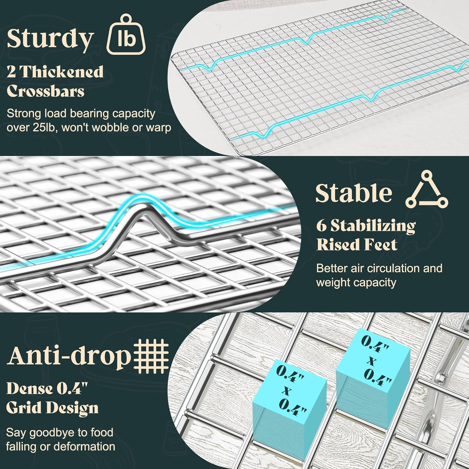 - TRUSTWORTHY MATERIALS: Our wire cooling rack is made entirely of food-grade 304 stainless steel, with narrow mesh, smooth edges, and uniquely designed vertical support rods, making our racks more heavy-duty and more stable