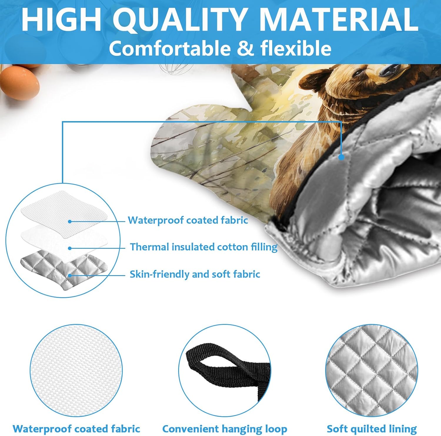 Watercolor Brown Bear Oven Mitts and Pot Holders Sets Heat Resistant 4Pcs Autumn Forest Animal Potholders Oven Gloves Hot Pads for Kitchen Baking Cooking Grilling BBQ
