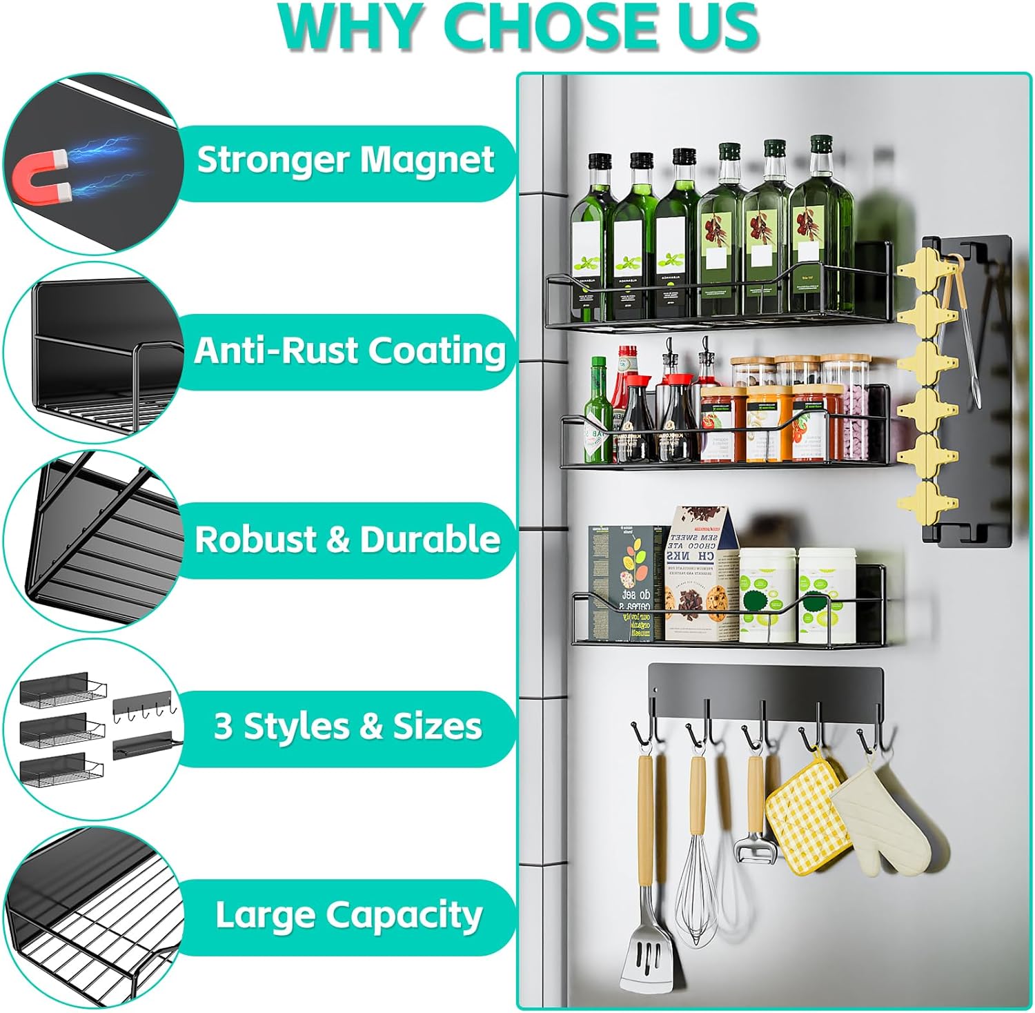 5 Pack Multifunctional Magnetic Shelves for Refrigerator Spice Rack & Washing Machine Organize, Include Towel Rack, Kitchen Utensil Hanger and Hooks, Strong Magnet for Secure Hold (Line style, Black)
