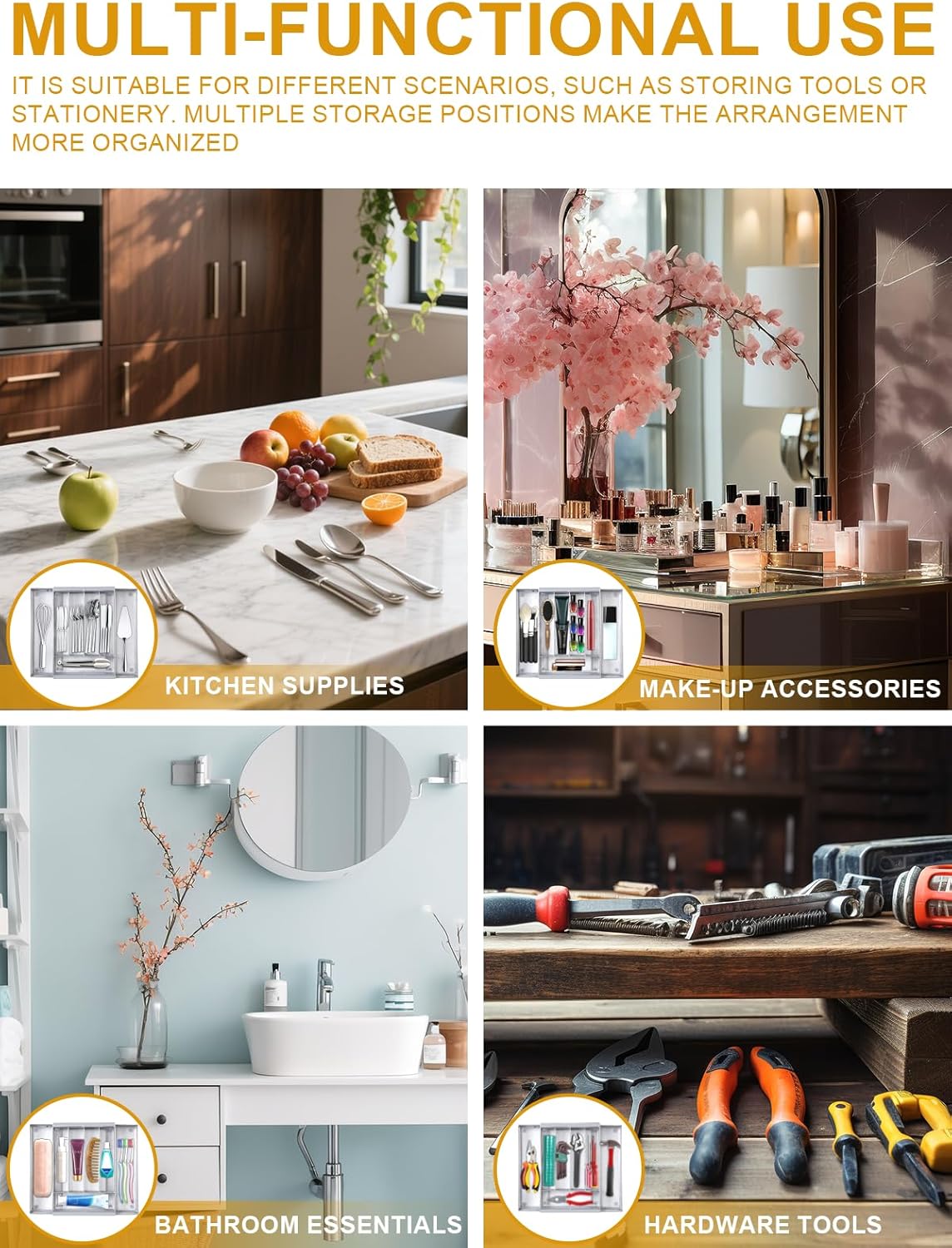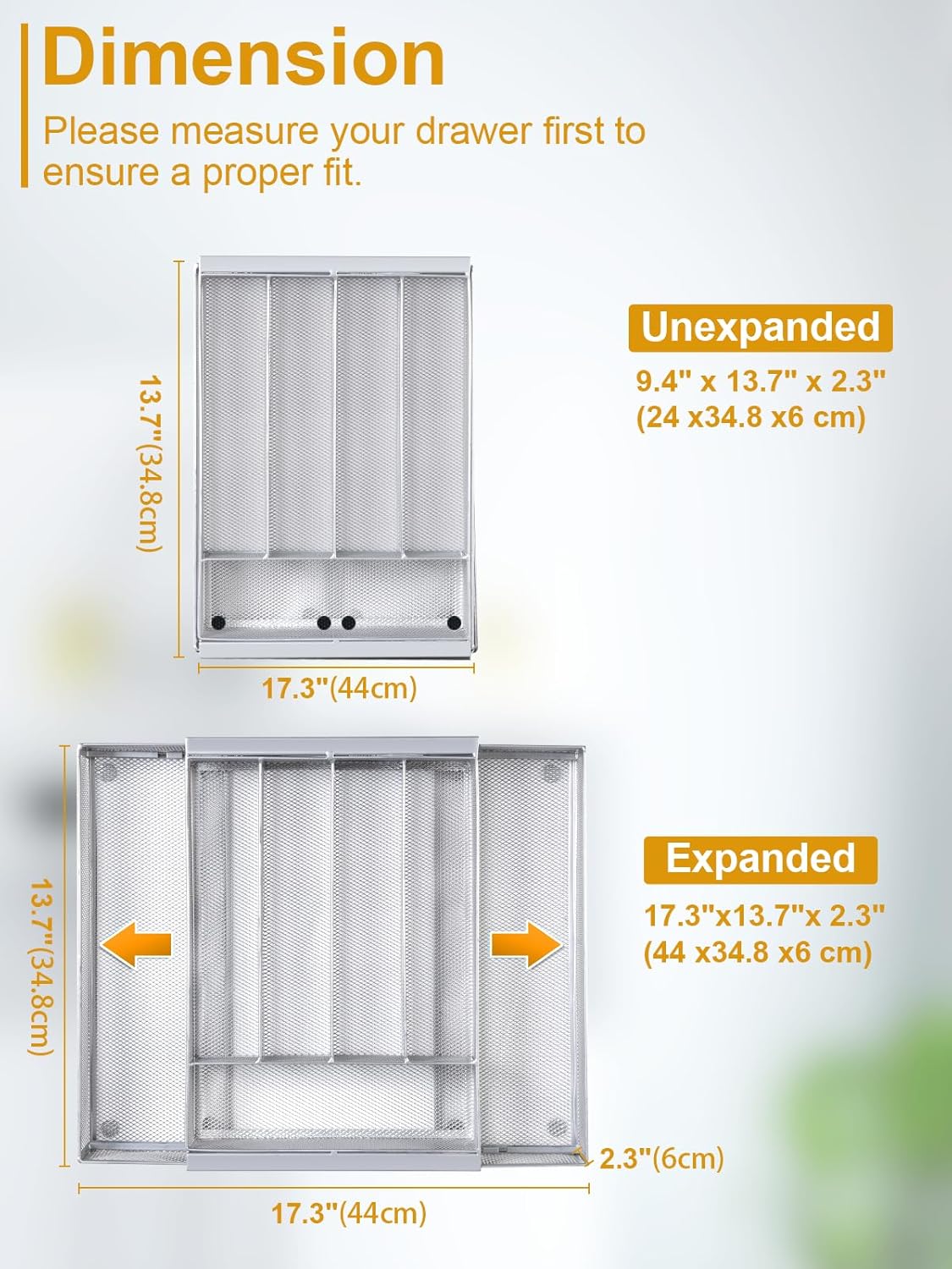 - Expandable Design: This Expandable Drawer Organizer Easily Adjusts From 5 to 7 Compartments, with a Width That Expands From 9.4" to 17.3". It Saves Space While Fitting All Your Kitchen Essentials with Ease.
