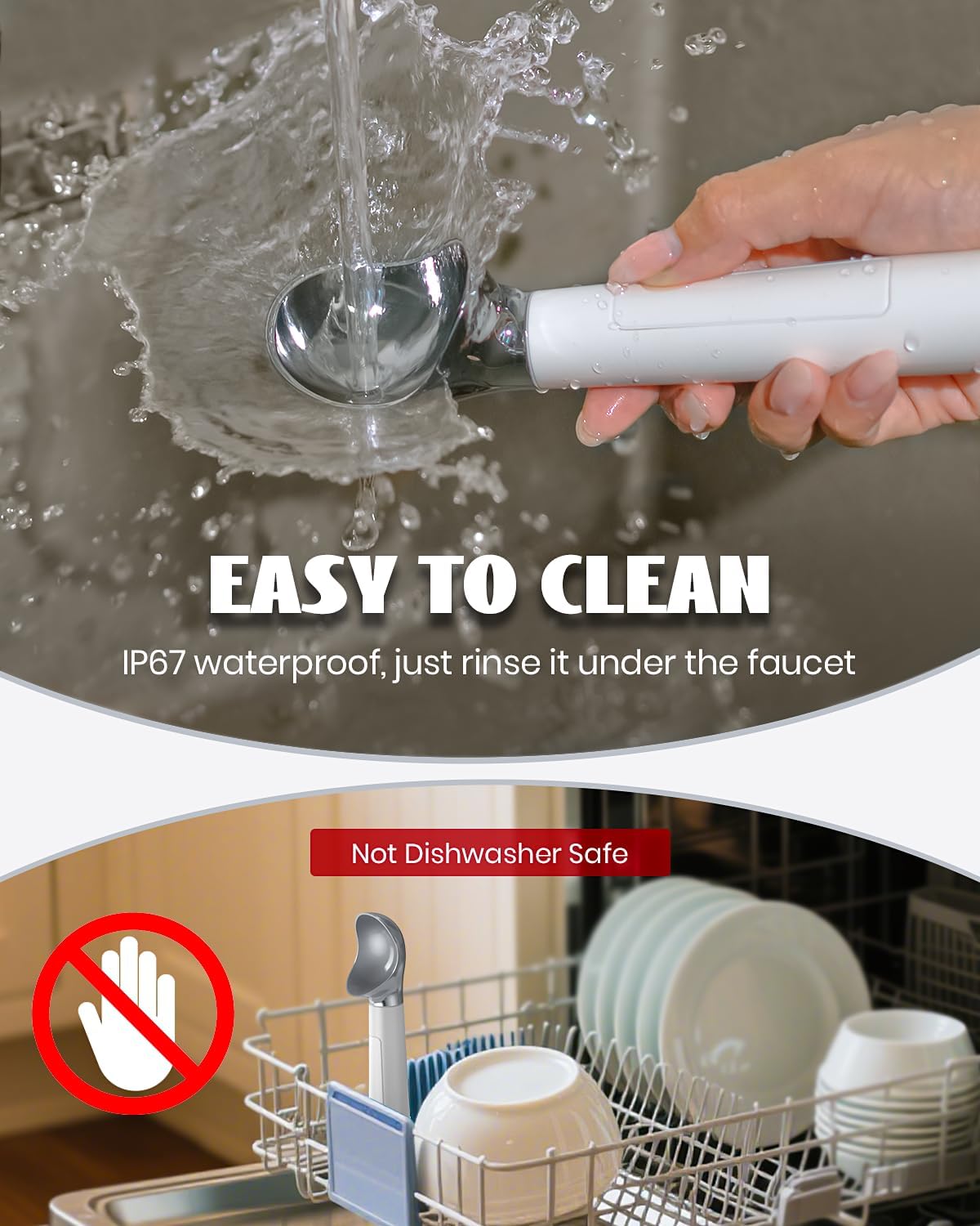 - 【IP67 Waterproof and Easy to Clean】With waterproof, anti - oxidation and anti - corrosion features, you can enjoy hassle - free maintenance. You can directly rinse it with water without worrying about damage. Keep the i e cream scoop clean and get ready for the next dessert feast. Note that the handle isn't waterproof, so avoid submerging it in water. Just wipe it with a damp cloth. It's not dishwasher safe.