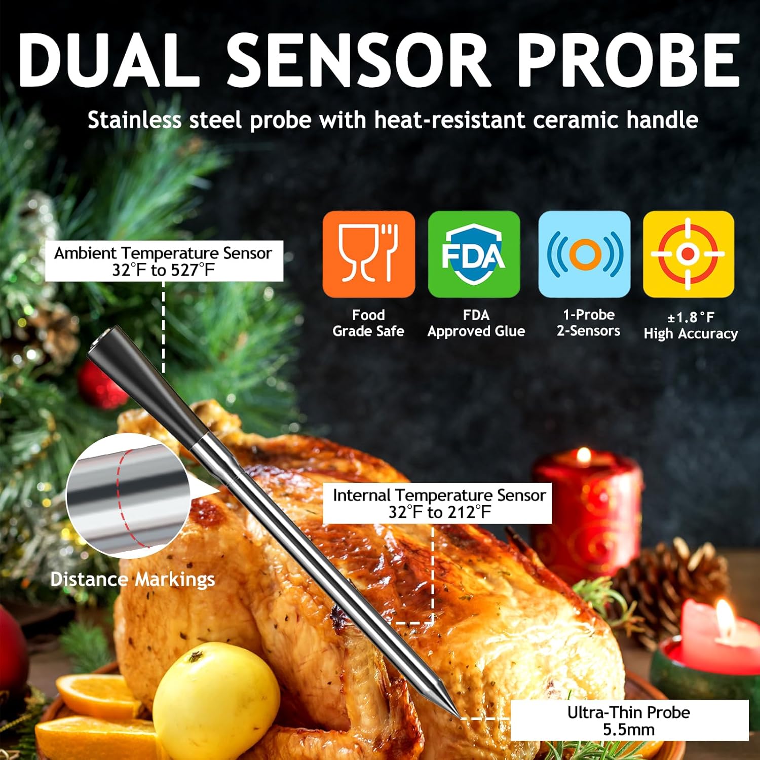 - 🌡️ Precise Dual Sensors – Internal & Ambient Temps: Monitor both internal food temps (32–212°F) and ambient cooking temps (32–527°F) with this advanced cooking thermometer. Ambient temps below 104°F may not appear in the app to protect sensor accuracy.