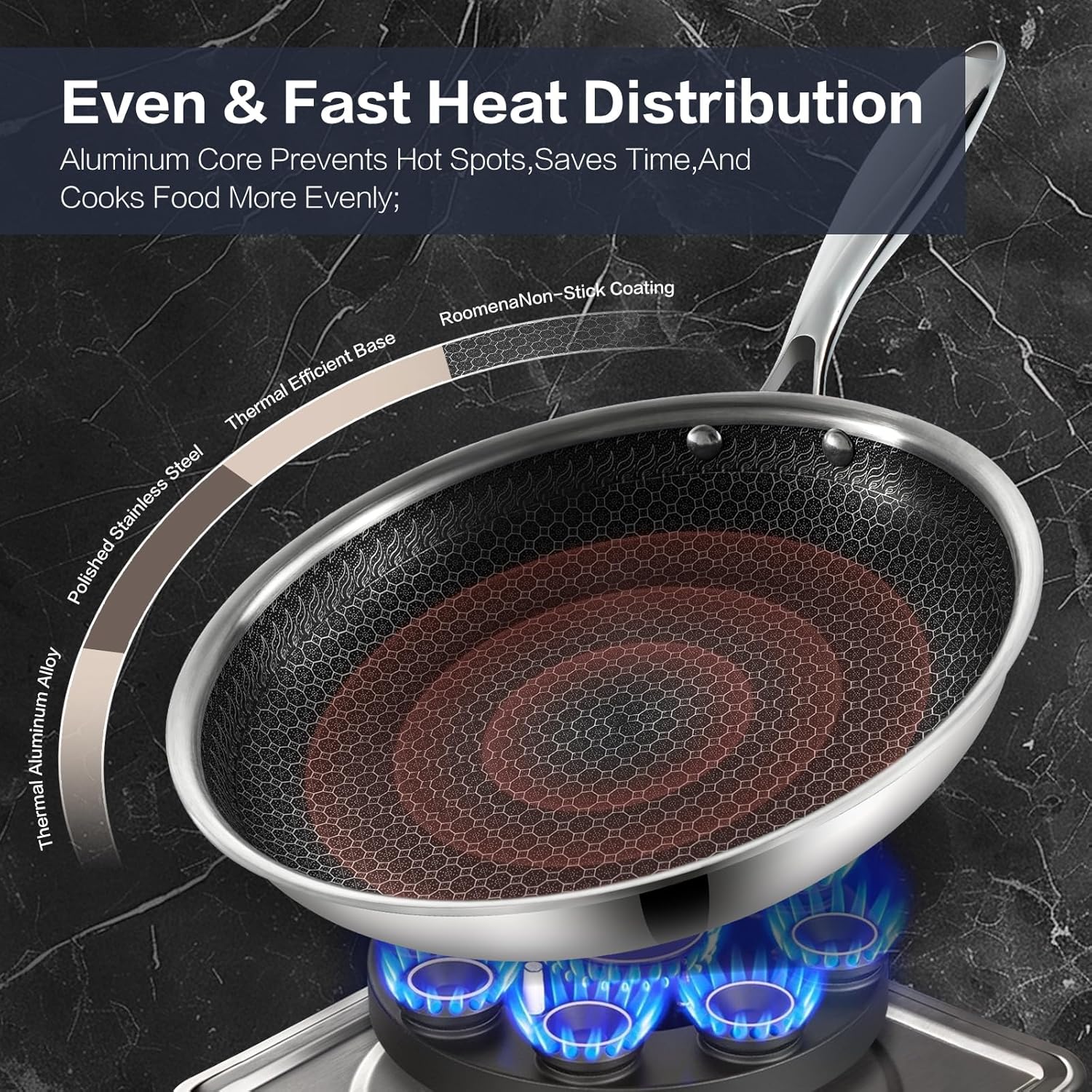- 【Revolutionize Your Cooking】: Elevate your culinary experience with the mixed-material non-stick set. Featuring a unique three-layer structure. It combines a stainless steel outer layer with an aluminum core for even heat distribution and lasting durability. The laser-etched surface blends stainless steel’s frying power with the non-stick material’s effortless food release. It makes every cooking moment a delight.