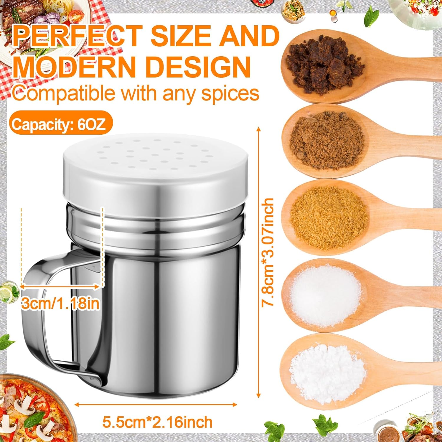 - Proper Size to Apply: the stainless steel dredge shakers with lid and handle are approx. 3.1 x 2.2 inches/ 7.8 x 5.5 cm and have a capacity of 6oz, The 6oz is the most common standard size for other spices, which avoids dust and water vapor from entering the bottle through the hole and keeps salt and pepper dry; The handles on one side help you to pick them up easily and make them more convenient to use