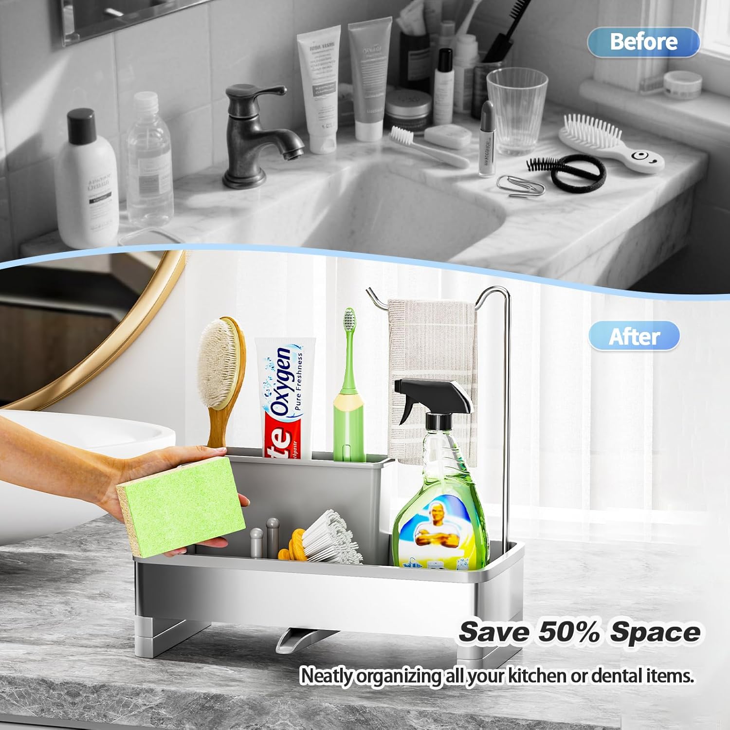 - ăVersatile Kitchen Sink OrganizerăThe sink caddy is not only suitable for kitchen sinks, but also for bathroom and vanity countertops, making it a great helper to keep things neat and organized. The kitchen sink organizer is easy to install and can be installed in less than five minutes. It is suitable as a gift for friends and family. If you have any questions, please contact customer service.