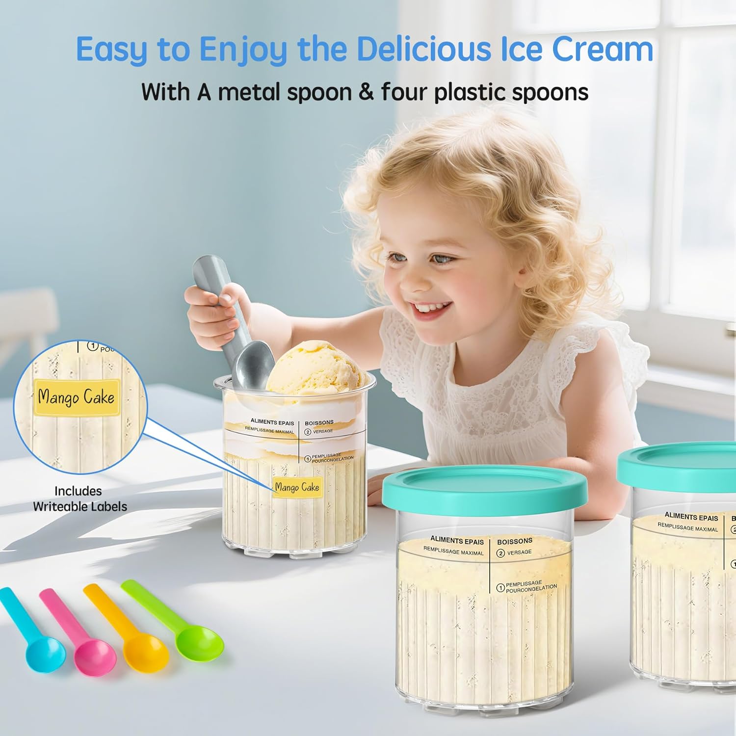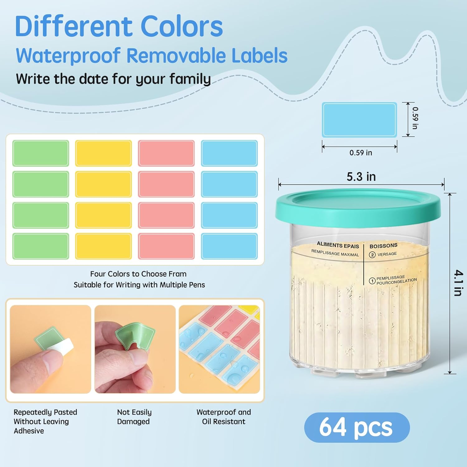 - COMPLETE MATCHING SET: This set comes with 4 pints, 4 lids, 4 spoons and 64pcs assorted colors waterproof removable labels can be writen flavor names/dates with pen and remove residue-free - ideal for allergy warnings or recipe experiments. Labels withstand freezer condensation without smudging.