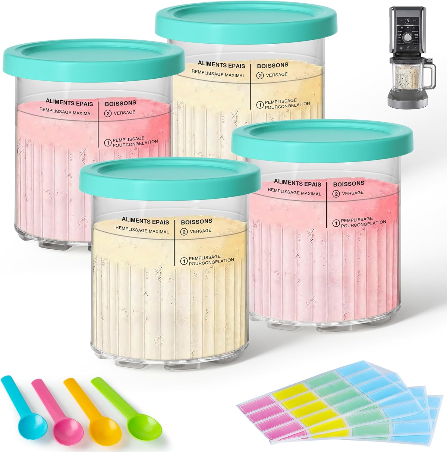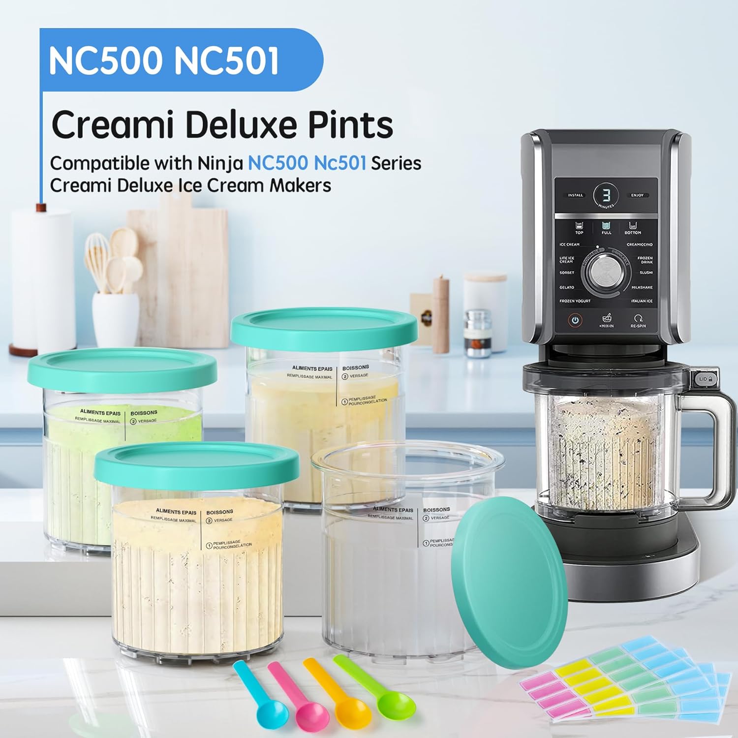 - PERFECT FIT MODEL: Compatible with Ninja NC500/NC501 Creami Deluxe 11-in-1 XL Ice Cream Makers. 24 OZ transparent pints with 4 blue lids - perfect for creating multiple ice cream varieties simultaneously, while making different flavors of ice cream for family & friends.