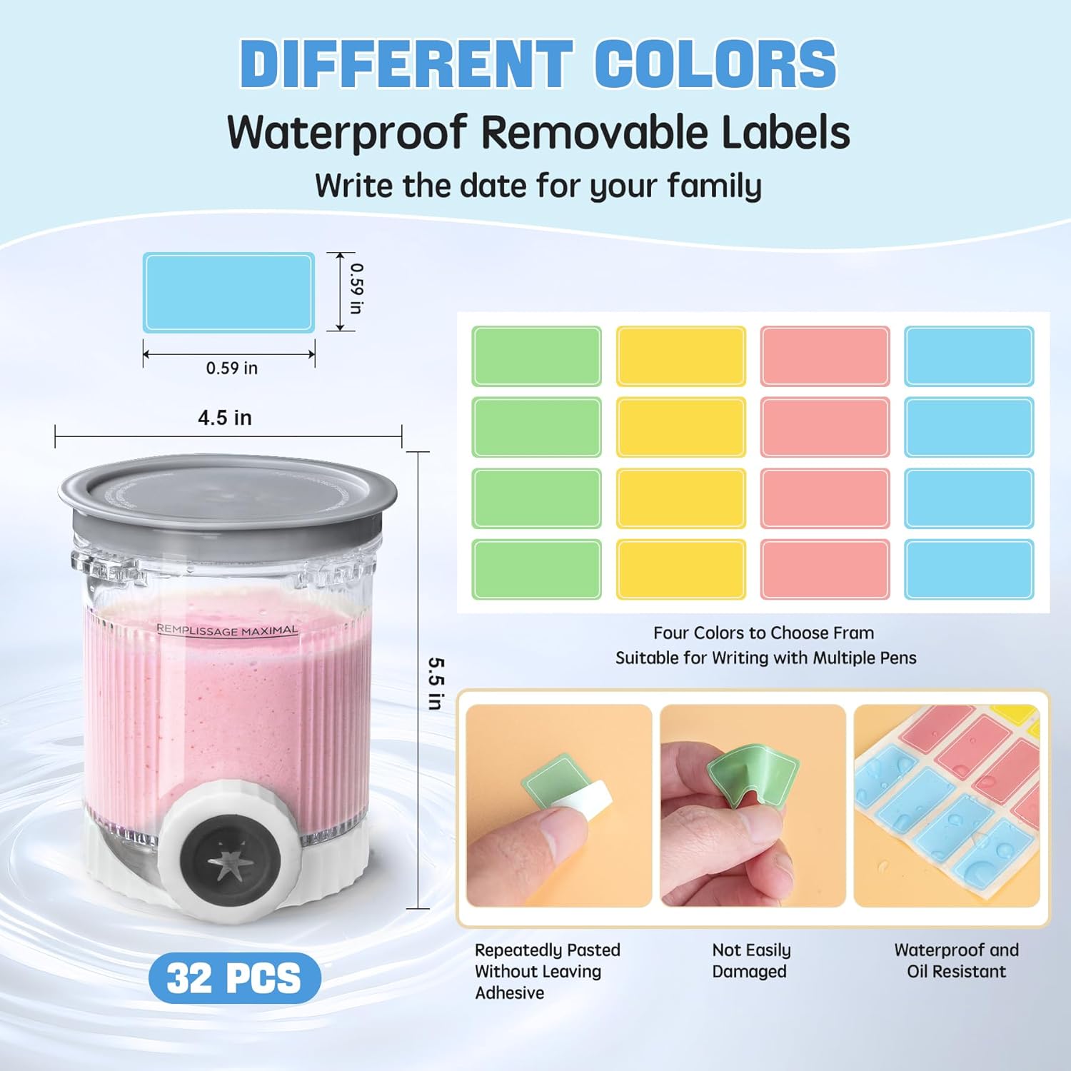 - COMPLETE MATCHING SET: This set comes with 4 pints & lids, 4 Nozzles, 4 spoons and 64pcs assorted colors waterproof removable labels can be writen flavor names/dates with pen and remove residue-free - ideal for allergy warnings or recipe experiments. Labels withstand freezer condensation without smudging.