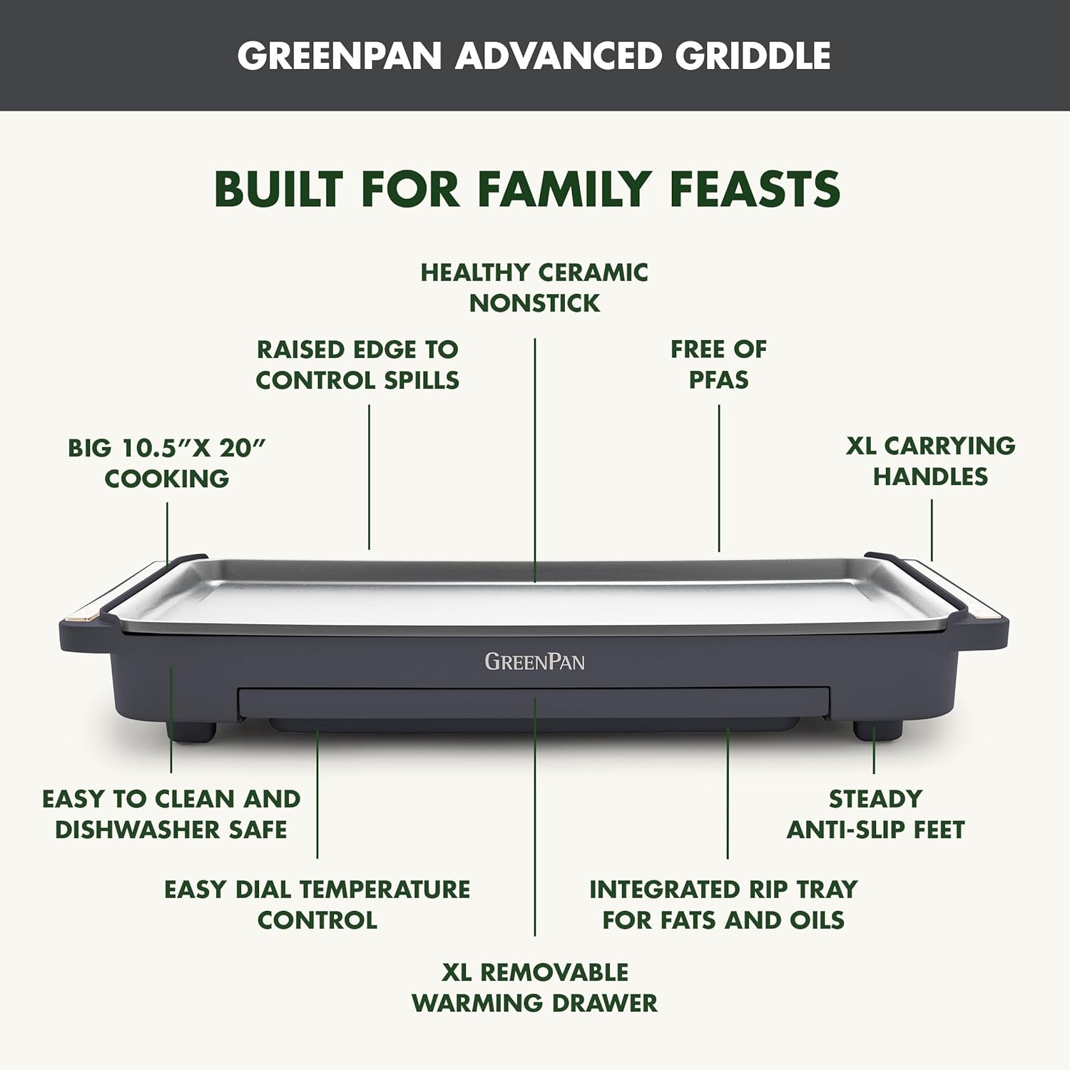 GreenPan Advanced 10.5”x 20” Electric Griddle with Warming Drawer, Healthy Ceramic Nonstick PFAS-Free Coating, Temperature Control, Easy and Versatile Countertop Meals, Dishwasher Safe, Graphite