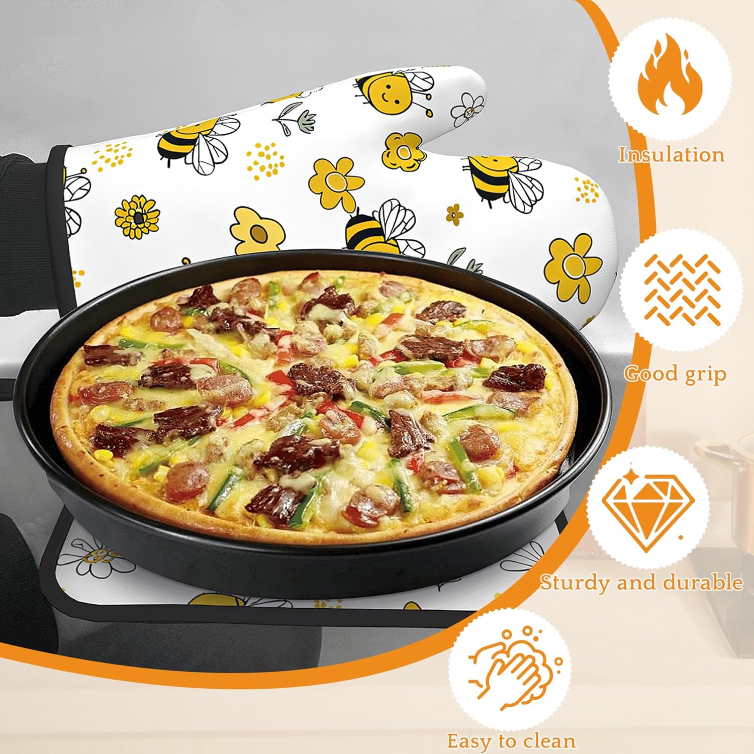Cute Bee Oven Mitts and Pot Holders,Flower Heat Resistant Oven Mitts Gloves and Pot Holder for Home Kitchen Decorations Cooking Baking BBQ Gifts,Set of 4