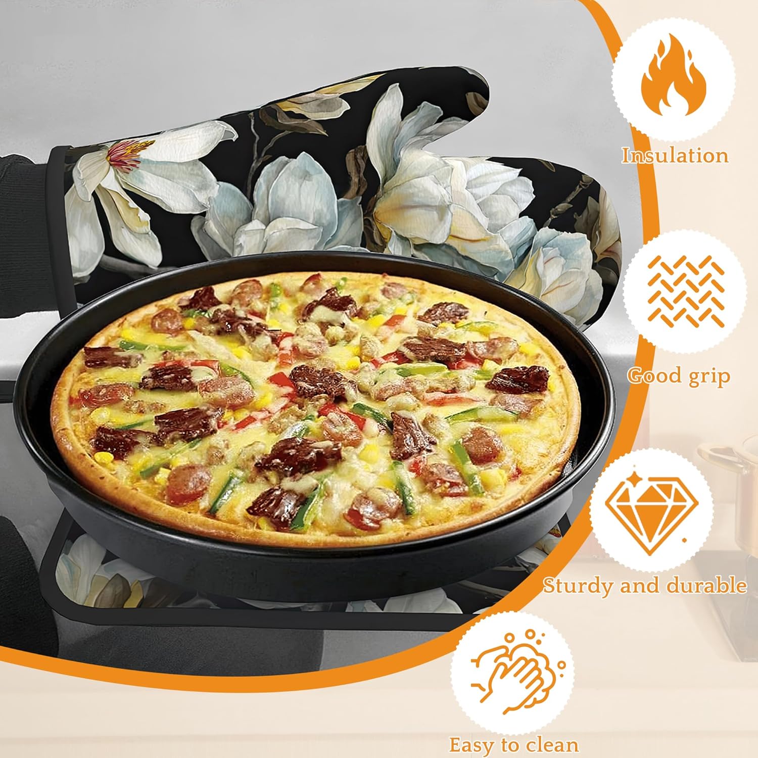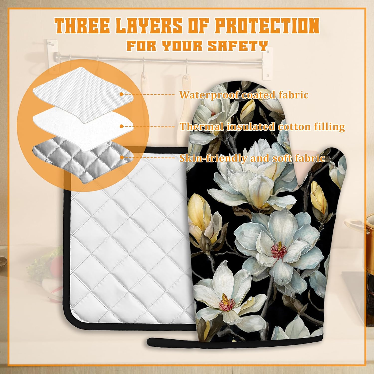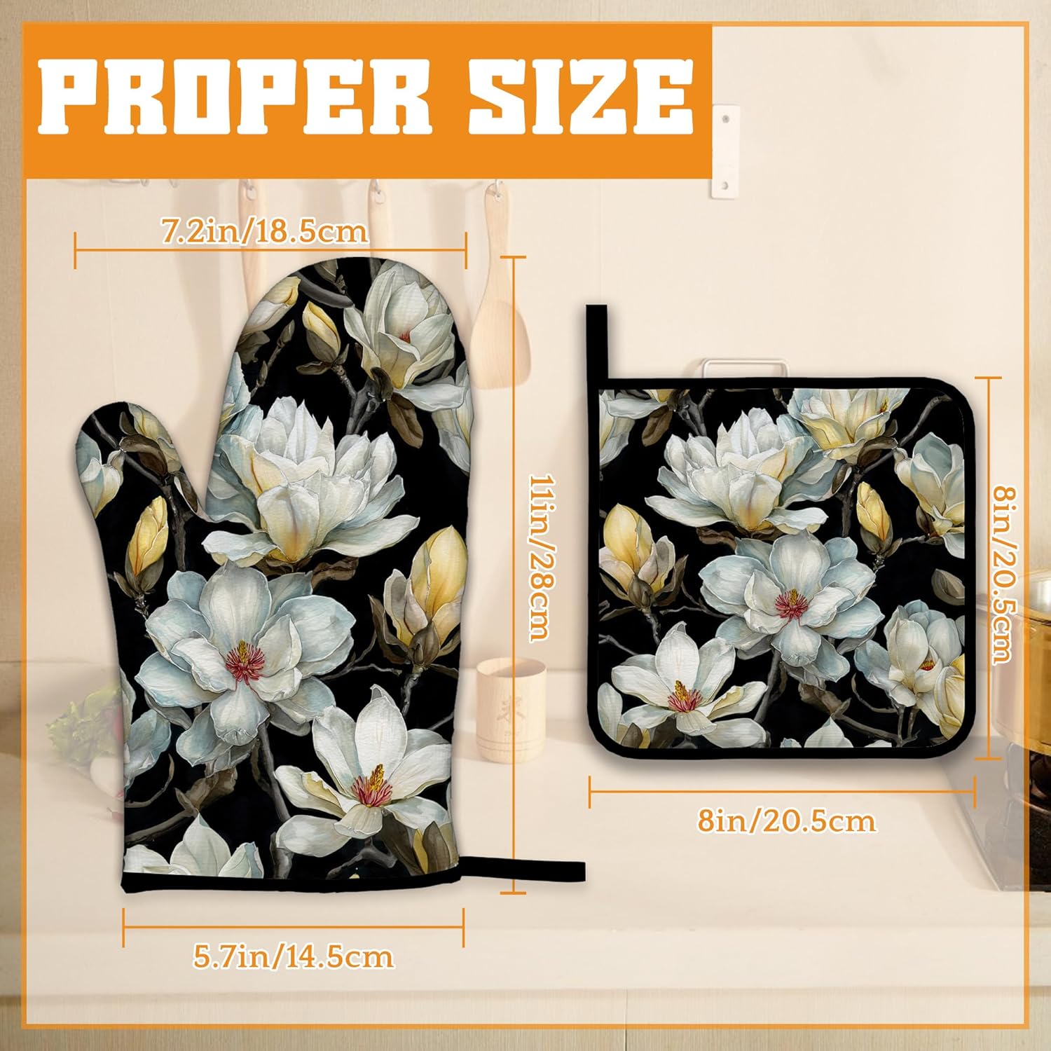 Vintage White Magnolia Oven Mitts and Pot Holders,Heat Resistant Oven Mitts Gloves and Pot Holder for Home Kitchen Decorations Cooking Baking BBQ Gifts,Set of 4