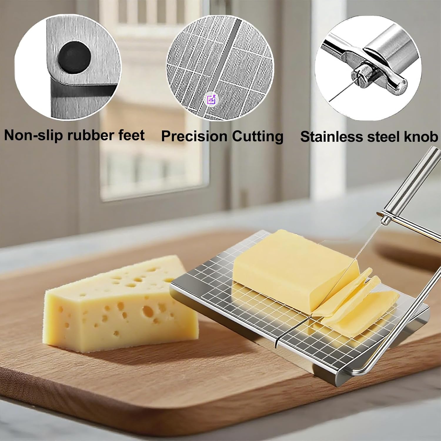 - SAFE STORAGE: Cheese slicers for block cheese adopts a practical locking design, which can be firmly fixed in place after use. It is very safe. The bottom of cheese cutters for block cheese is equipped with non-slip rubber feet to reduce unnecessary movement and sliding
