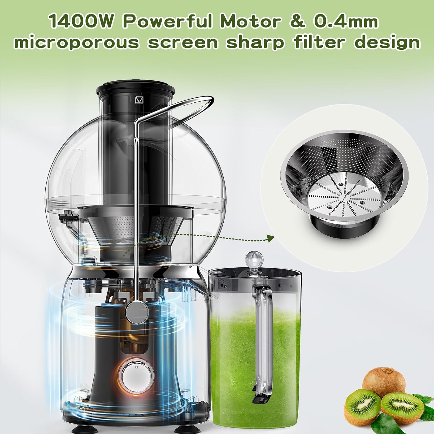 - INTERESTING PLANET CUP DESIGN: The Vospeed Juice Extractor is powered by a 750-watt high-speed motor that extracts 20% more juice and 75% more vitamins and minerals. It is designed to maximize juice production. The intuitive planetary structure allows you to see the juicing process. Keep your countertops clean and tidy with this juicer's unique drip-free nozzle and 1200ML capacity cup.