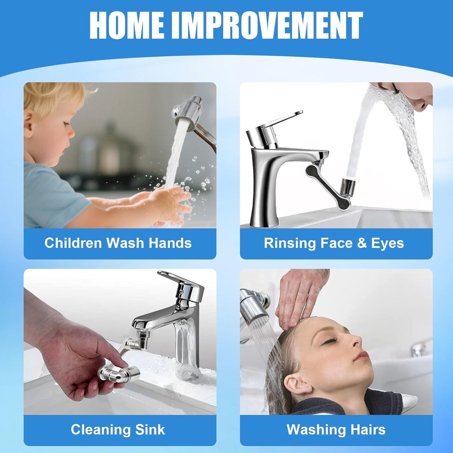 - 1080° Flexible Faucet Aerator :Equipped with three 360° rotating joints, this swivel faucet extender allows for full 1080° adjustment. It bends and folds freely, easily reaching all corners of the sink. Perfect for hands-free face washing, brushing teeth, or rinsing hair. A practical upgrade from traditional faucets — ideal for kids, seniors, and people with long hair.