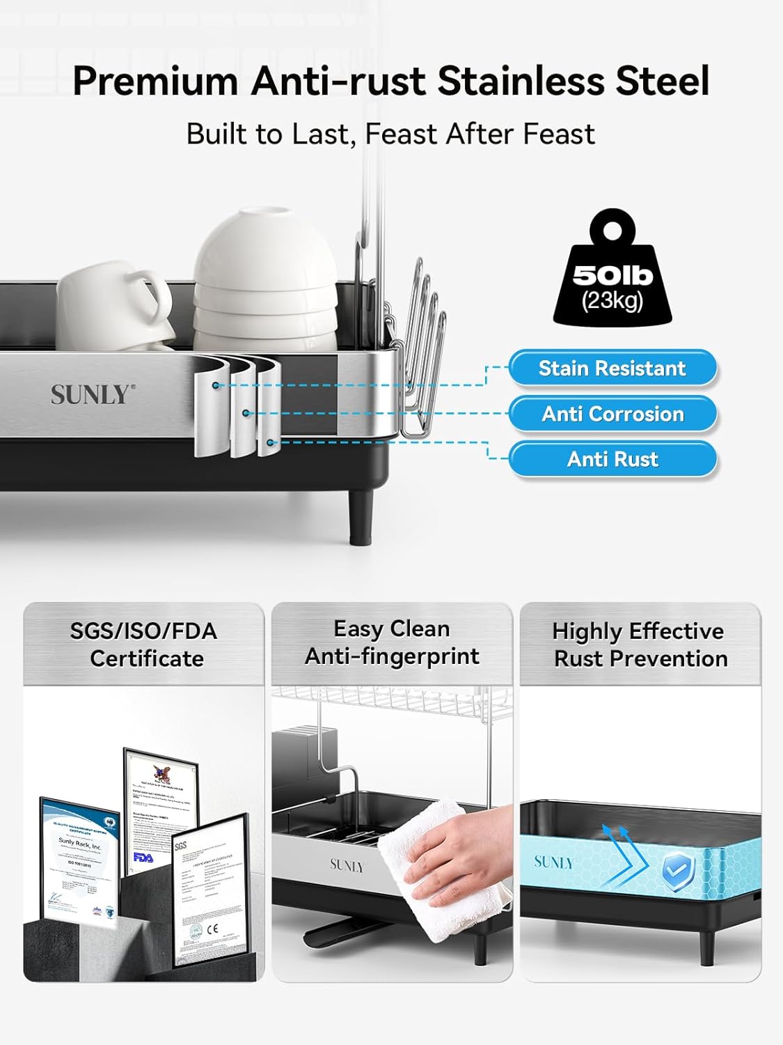 - [Larger Capacity & 2-Tier Design]: The Sunly Large 2-Tier Stainless Steel Dish Drying Rack measures 12.6βD x 22.48βW x 15.16βH, maximizing kitchen counter space for large families.