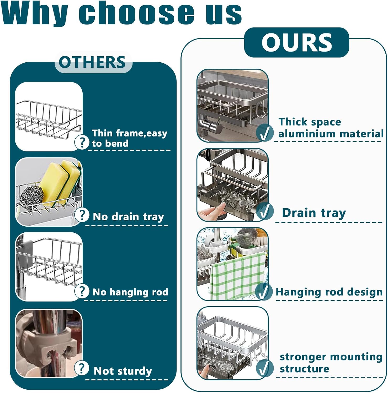 - đ ď¸ăDurable Rustproof Aluminum MaterialăMade of premium space aluminum, this sponge holder is rust-resistant, lightweight, and built to last in wet kitchen environments.