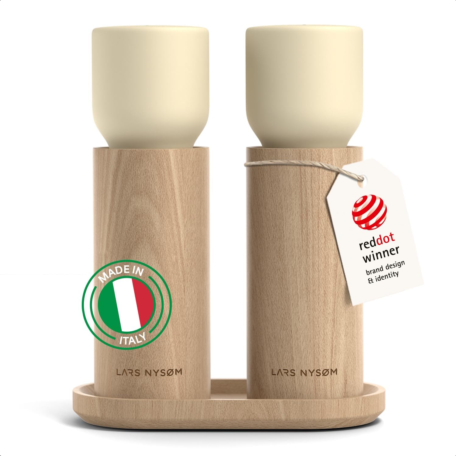 LARS NYSØM Wooden Salt and Pepper Grinder Set Manual with Tray - Salt and Pepper Mills with Adjustable Ceramic Grinder - Elegant Beechwood Pepper and Salt Mill Set for Dining Table (Almond Beige)