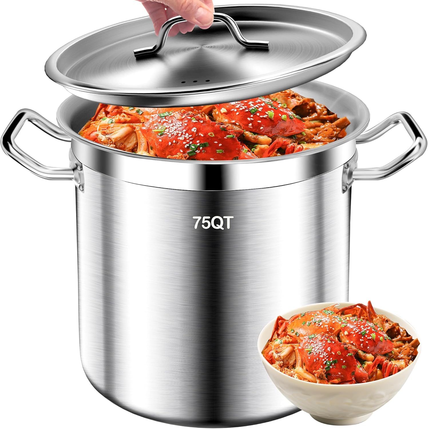 - 75 QUART LARGE COOKING POT & ERGONOMIC DESIGN: Our big pots for cooking feature a reinforced and thickened riveted stainless steel handle, ergonomically designed for comfort. This 75 quart large capacity pasta pot is perfect for slow cooking, cooking pasta, stews, seafood, lobster, soup, and other dishes. Great for family meals, parties, and holiday gatherings.