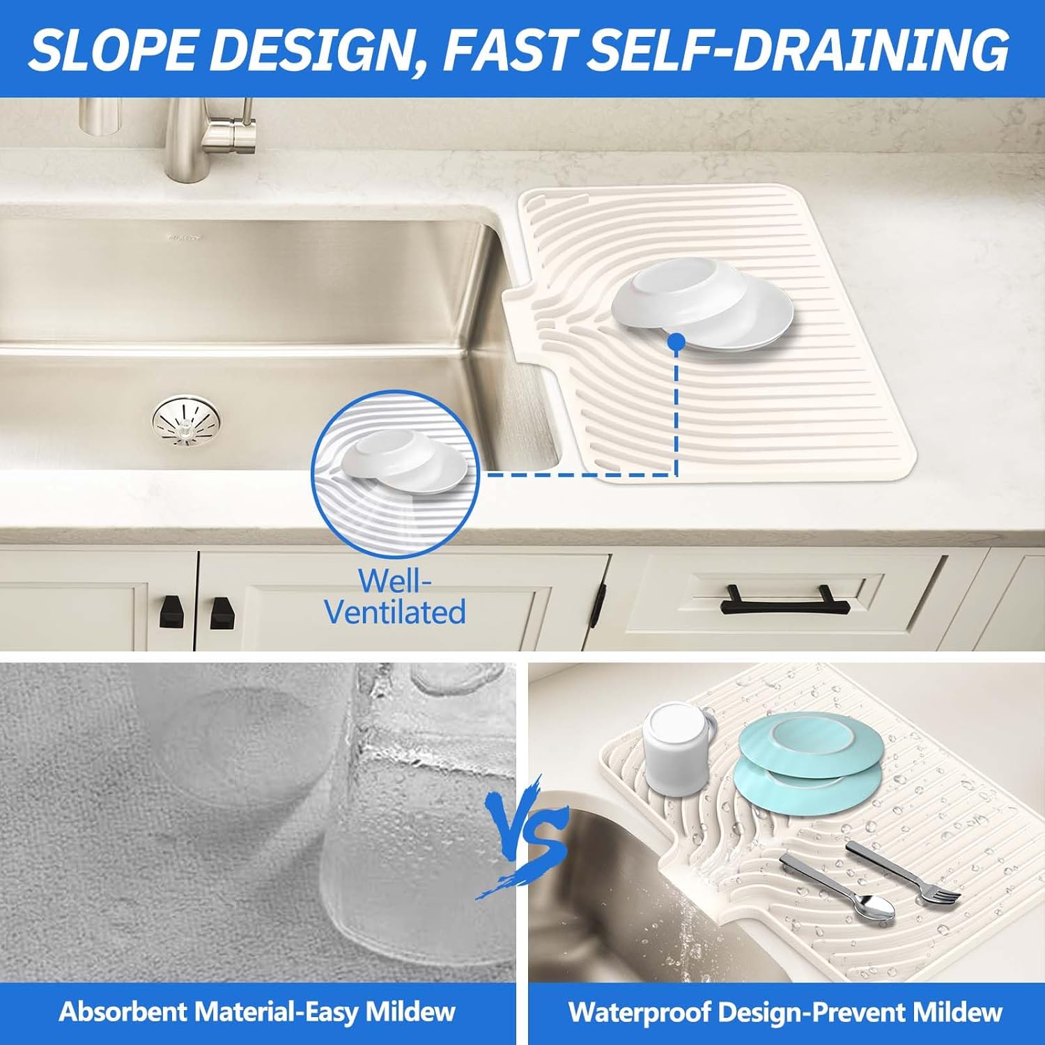 - Slope Design, Fast Self-Draining: JACZZO dish drying mat have increased the thickness and weight. Latest 5° slope design allows for faster and smoother water discharge and faster drying. This means no puddles to clean up & no water spots by the sink. Give your kitchen sink an effort-saving upgrade