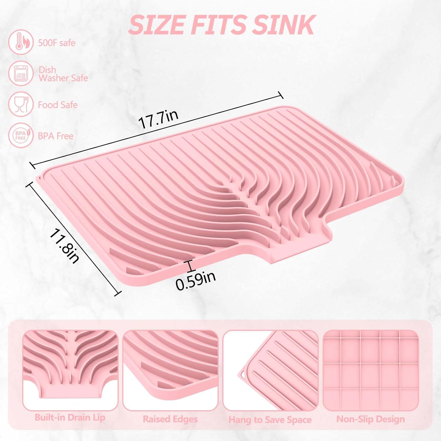 Silicone Dish Drying Mat for Kitchen Counter with Built-in Drain, Easy Clean Pad for Countertop Protection, Fast Self-Draining Slope, Non-Slip, Multiple Use 17.7 x 11.8 Inch (Pink)