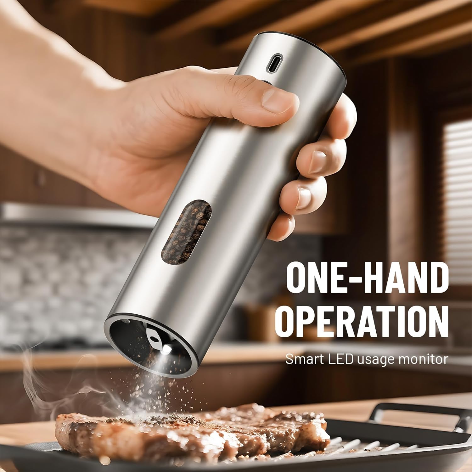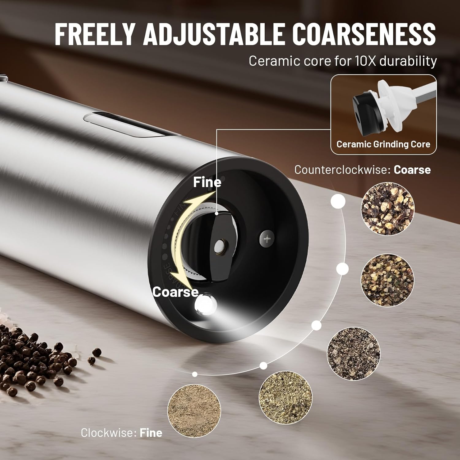 - 【Premium & Stylish Material】Crafted from high-quality stainless steel, this durable electric pepper mill resists corrosion and scratches while maintaining its elegant appearance, the food-grade material ensures or absorb odors. Includes spice storage bags to keep peppercorns and salt fresh.
