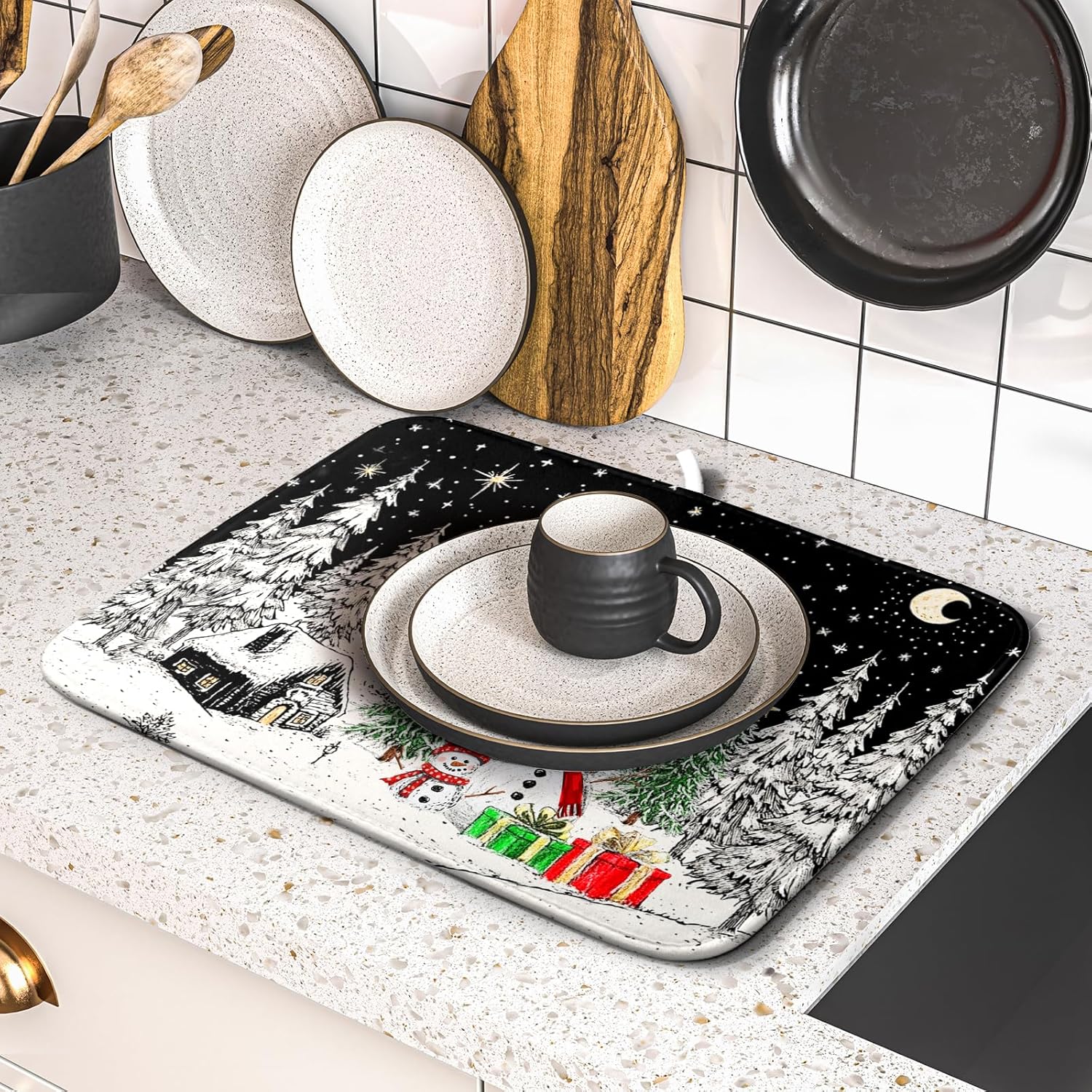 Winter Snowman Dish Drying Mat 18 X 16 in Black Microfiber Dish Pad Absorbent Holiday Kitchen Accessories