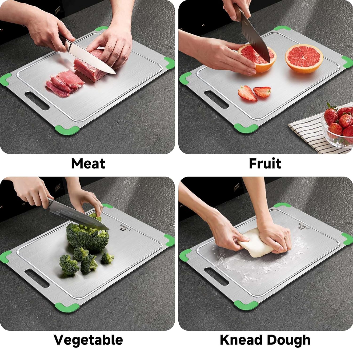 100% Pure Titanium Cutting Board with Grooves, Update Double Side Titanium Chopping Board, Silicone Anti-slip Stainless Cutting Boards for Kitchen 11 * 15 IN, Green